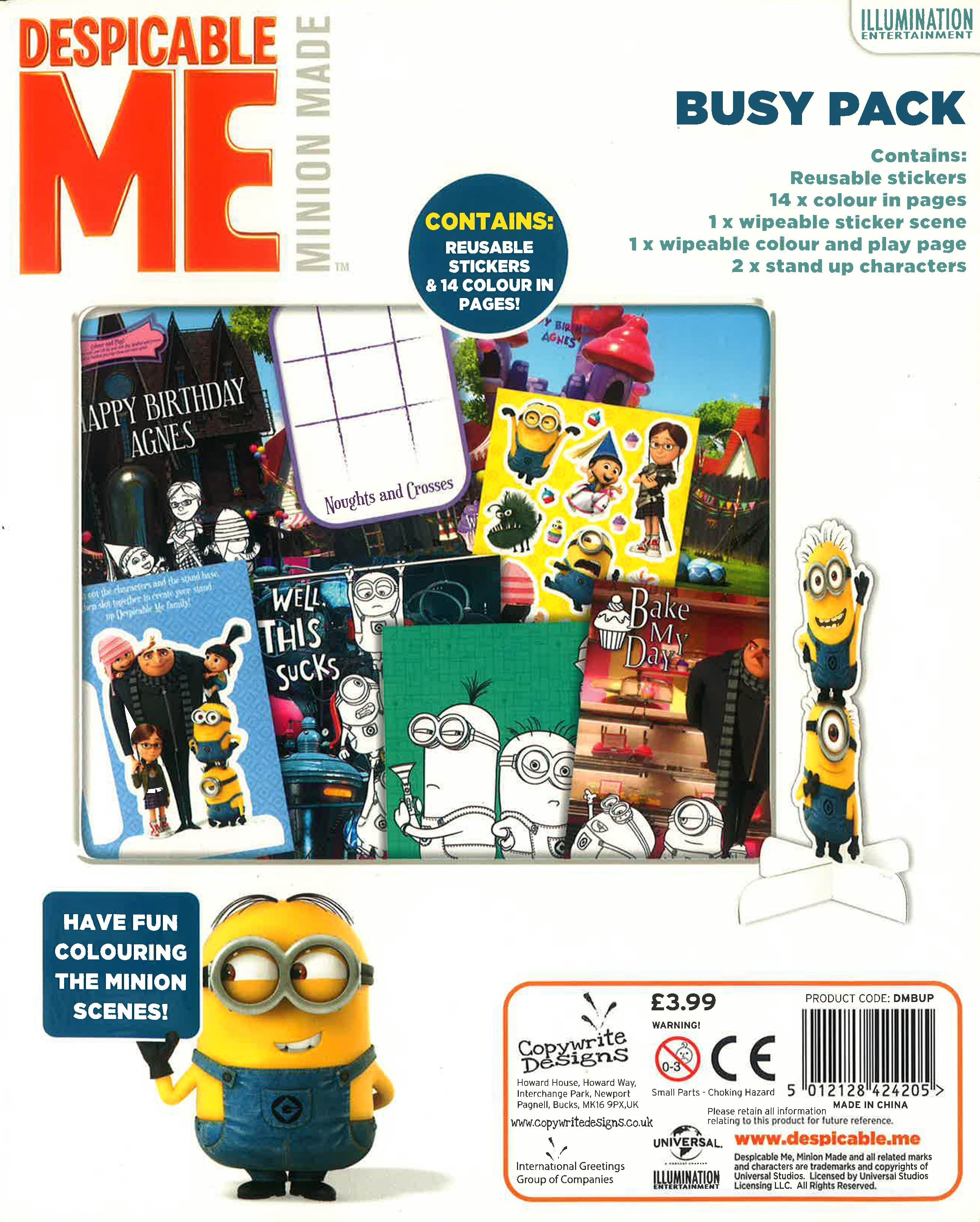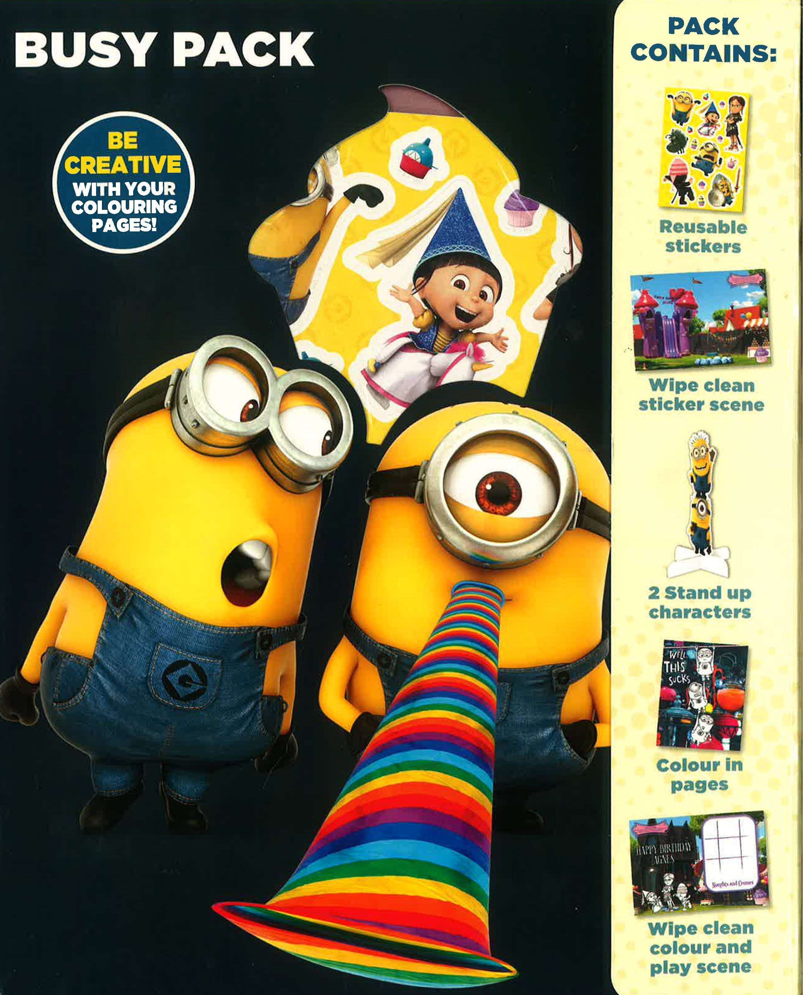 Busy Pack contains: -Reusable stickers -14 x colour in pages -1 x wipeable sticker scene -1 x wipeable colour and play page -2 x stand up characters