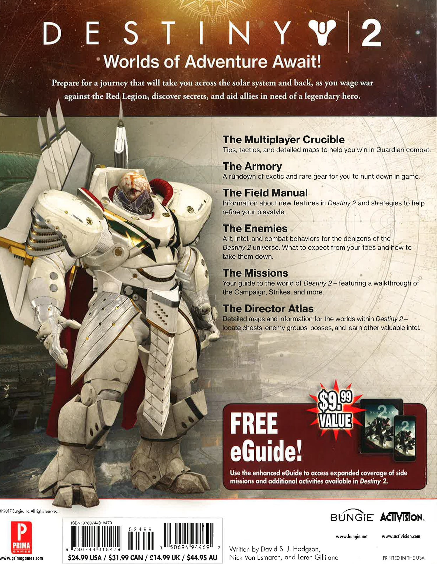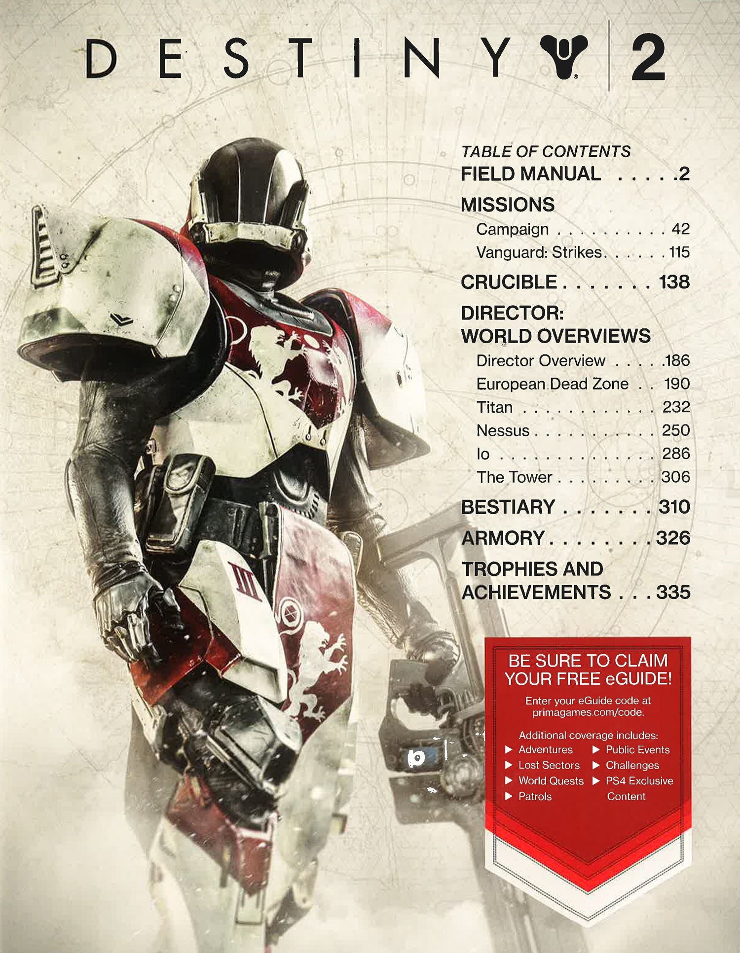 Art Gallery- A collection of artwork and concepts from the creators at Bungie The Multiplayer- Crucible Tips, tactics, and detailed maps to help you win in Guardian combat. The Armory- A rundown of exotic and rare gear for you to hunt down in game. The Field Manual- Information about new features in Destiny 2 and strategies to help refine your playstyle. The Enemies- Art, intel, and combat behaviors for the denizens of the Destiny 2 universe. What to expect from your foes and how to take them down. The Missions- Your guide to the world of Destiny 2 - featuring a walkthrough of the Campaign, Strikes, and more. The Director Atlas- Detailed maps and information for the worlds within Destiny 2 - locate chests, enemy groups, bosses, and learn other valuable intel. Free eGuide- Use the enhanced eGuide to access expanded coverage of the side missions and additional activities available in Destiny 2.