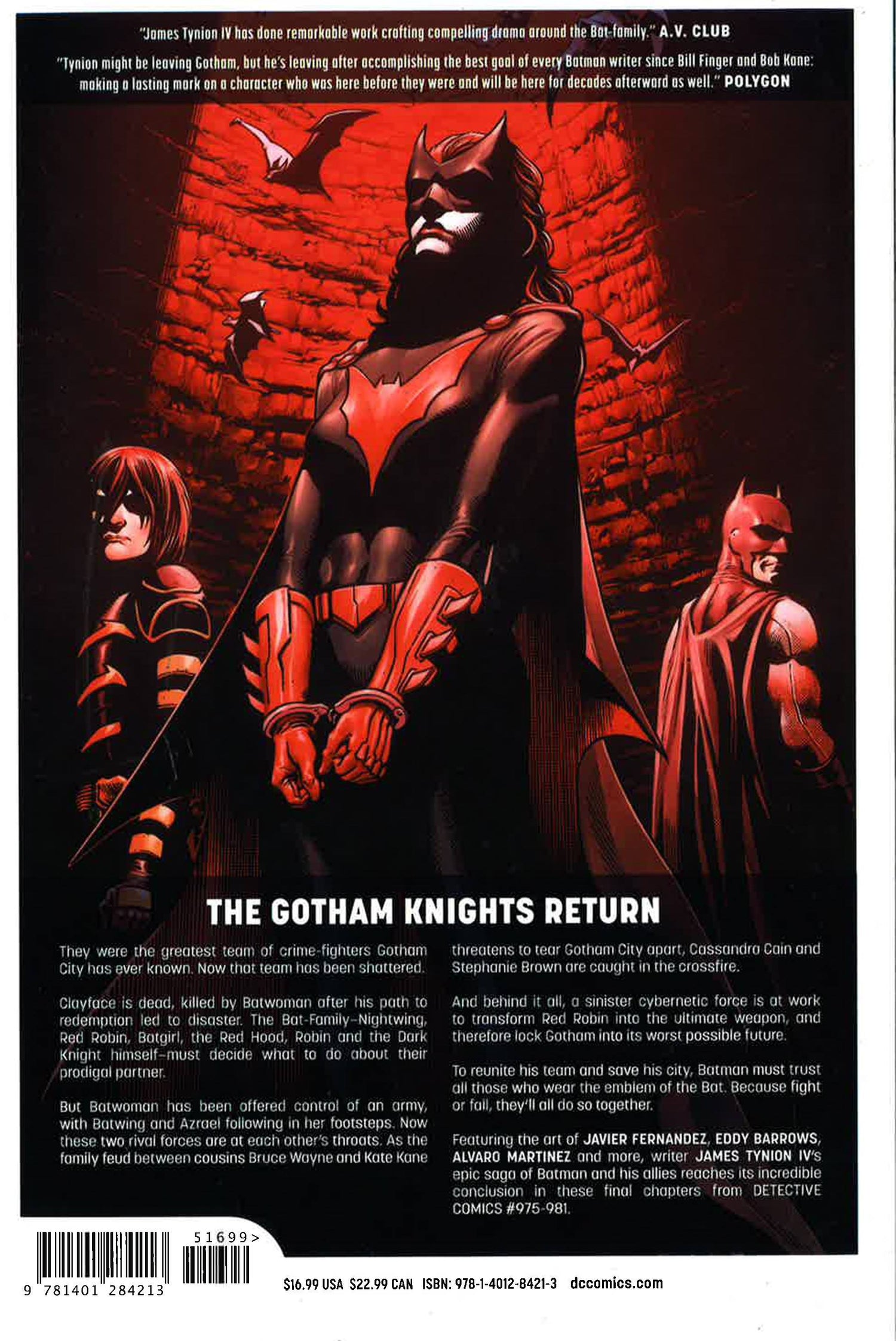 They were the greatest team of crime-fighters Gotham City has ever known. Now that team has been shattered. Clayface is dead, killed by Batwoman after his path to redemption led to disaster. The Bat-Family--Nightwing, Red Robin, Batgirl, the Red Hood, Robin and the Dark Knight himself--must decide what to do about their prodigal partner. But Batwoman has been offered control of an army, with Batwing and Azrael following in her footsteps. Now these two rival forces are at each other's throats. As the family feud between cousins Bruce Wayne and Kate Kane threatens to tear Gotham City apart, Cassandra Cain and Stephanie Brown are caught in the crossfire. And behind it all, a sinister cybernetic force is at work to transform Red Robin into the ultimate weapon, and therefore lock Gotham into its worst possible future. To reunite his team and save his city, Batman must trust all those who wear the emblem of the Bat. Because fight or fall, they'll all do so together. Featuring the art of Javier Fernandez, Eddy Barrows, Alvaro Martinez and more, writer James Tynion IV's epic saga of Batman and his allies reaches its incredible conclusion in these final chapters from Detective Comics #975-981.