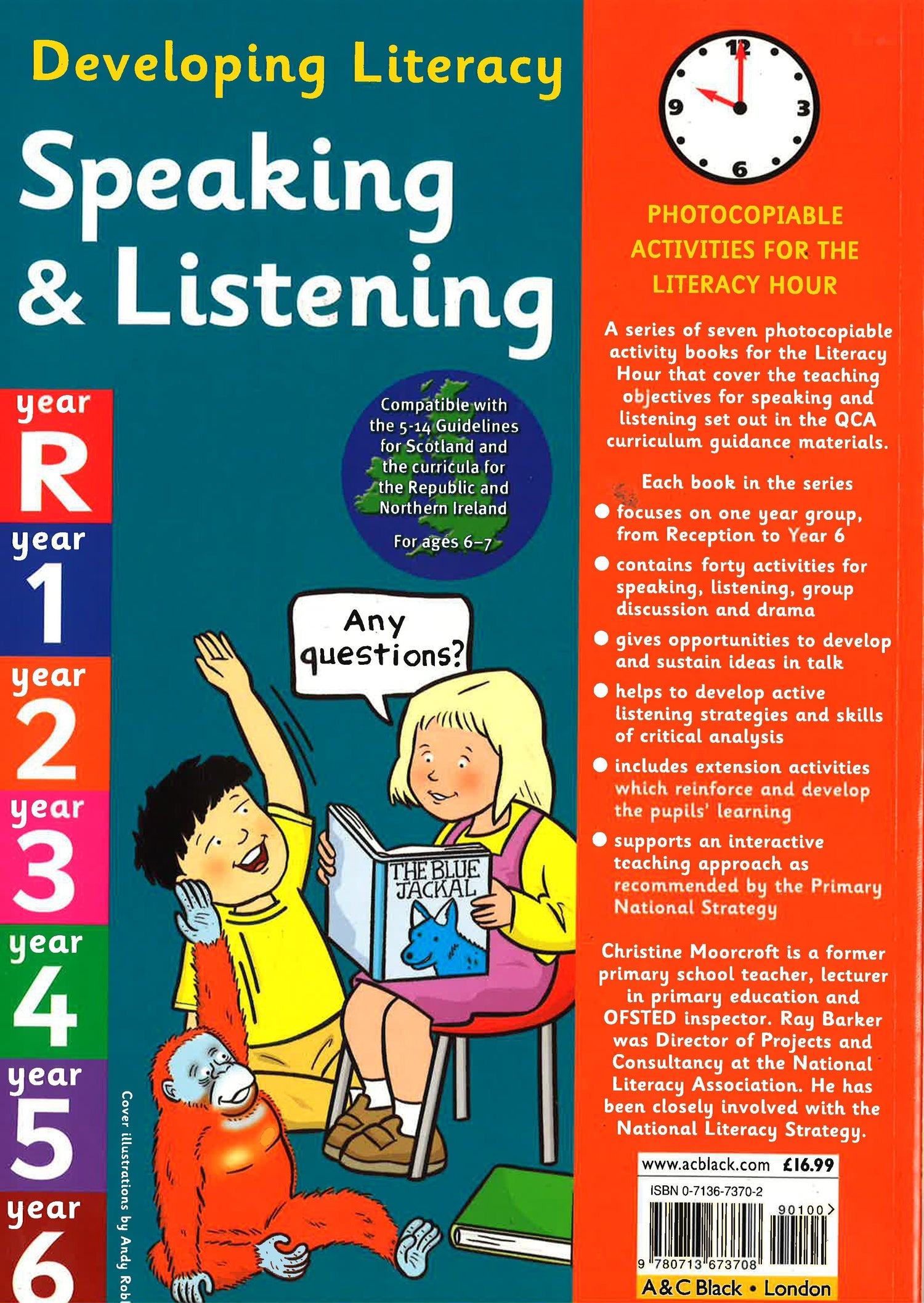 Speaking and Listening is a brand new strand of the best-selling series Developing Literacy. There is one book of photocopiable activity sheets for each year of primary school. The government have recently published a complete set of teaching objectives for this important area in a document entitled Speaking, listening, learning: Working with children in KS1 and KS2 which was sent to all primary school teachers, heads and deputies. This has given a higher status to talk in the classroom. These books provide a wealth of focused tasks and activities designed to develop skills in speaking, listening, group discussion and interaction, and drama.