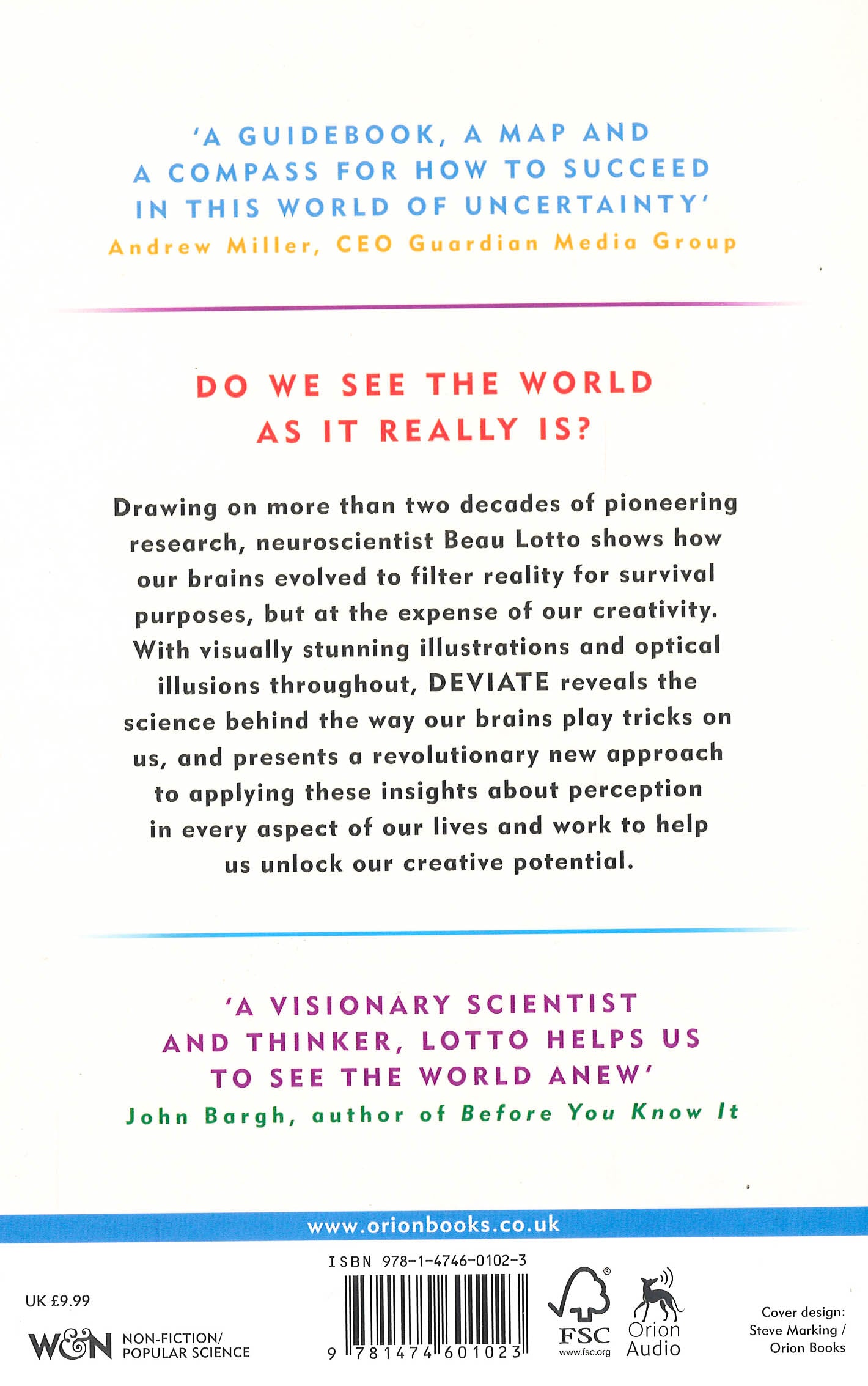 World-renowned neuroscientist Beau Lotto reveals the truths of human perception and devises a cognitive toolkit for how to succeed in a world of uncertainty.Perception is the foundation of human experience, but few of us understand how our own perception works. By revealing the startling truths about the brain and perception, Beau Lotto shows that the next big innovation is not a new technology: it is a new way of seeing.In his first major book, Beau Lotto draws on over a decade of pioneering research to show how our brains play tricks on us. With an innovative combination of case studies and optical- and perception-illusion exercises, DEVIATE will revolutionise the way you see the world. With this new understanding of how the brain works and its perceptive trickery, we can apply these insights to every aspect of life and work. DEVIATE is not just an engaging look into the neuroscience of thought, behaviour and creativity: it is a call to action, enlisting readers in their own journey of self-discovery.