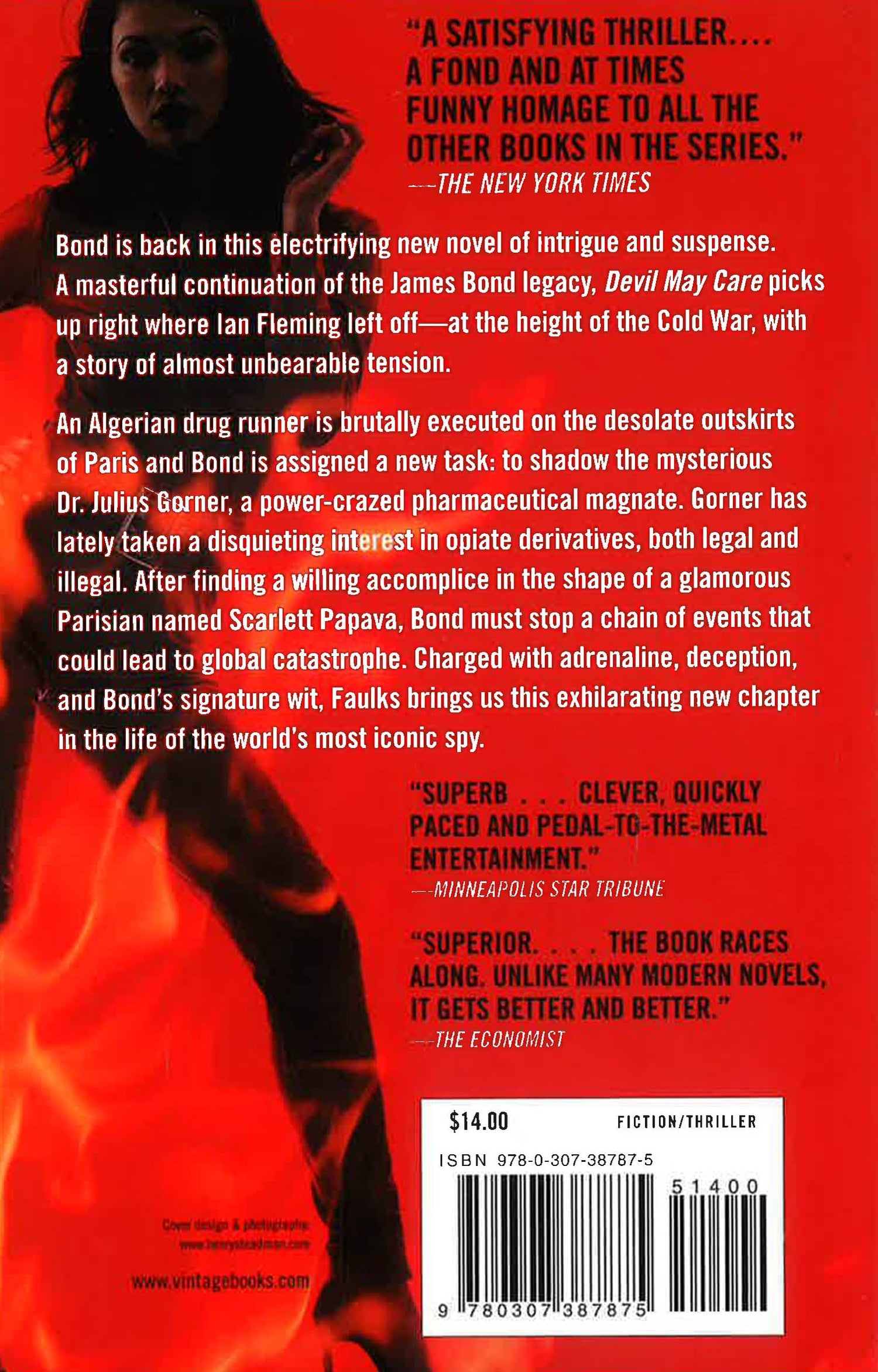 Bond is back in this electrifying new novel of intrigue and suspense. A masterful continuation of the James Bond legacy, Devil May Care picks up right where Ian Fleming left off--at the height of the Cold War, with a story of almost unbearable tension. An Algerian drug runner is brutally executed on the desolate outskirts of Paris and Bond is assigned a new task; to shadow the mysterious Dr. Julius Gorner, a power-crazed pharmaceutical magnate. Gorner has lately taken a disquieting interest in opiate derivatives, both legal and illegal. After finding a willing accomplice in the shape of a glamorous Parisian named Scarlett Papava, Bond must stop a chain of events that could lead to global catastrophe. Charged with adrenaline, deception, and Bond's signature wit, Faulks brings us this exhilarating new chapter in the life of the world's most iconic spy.