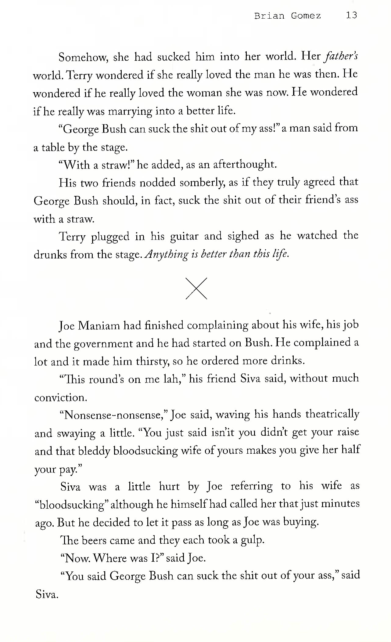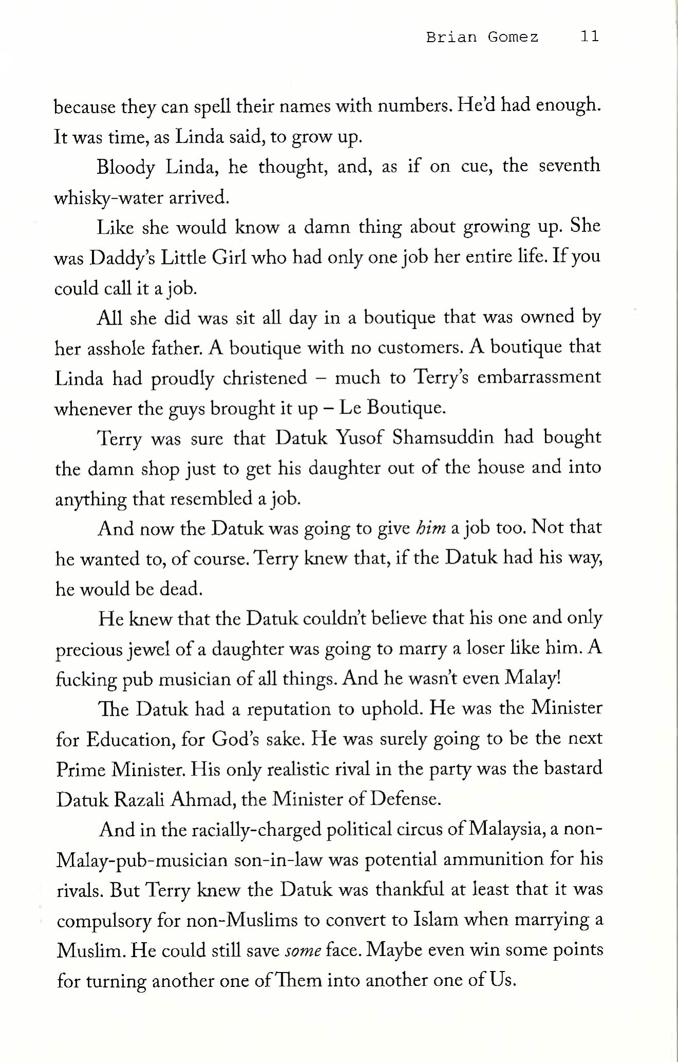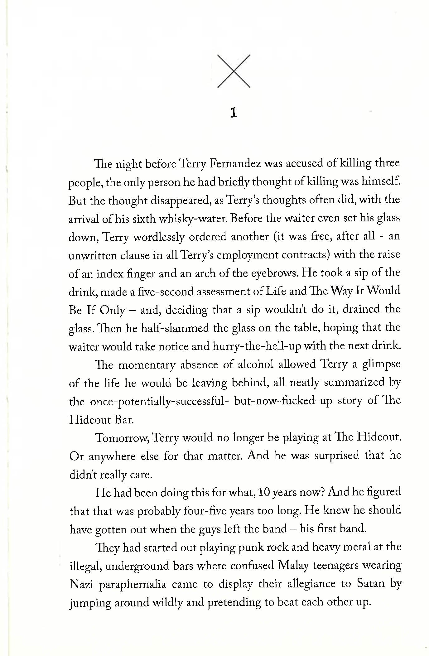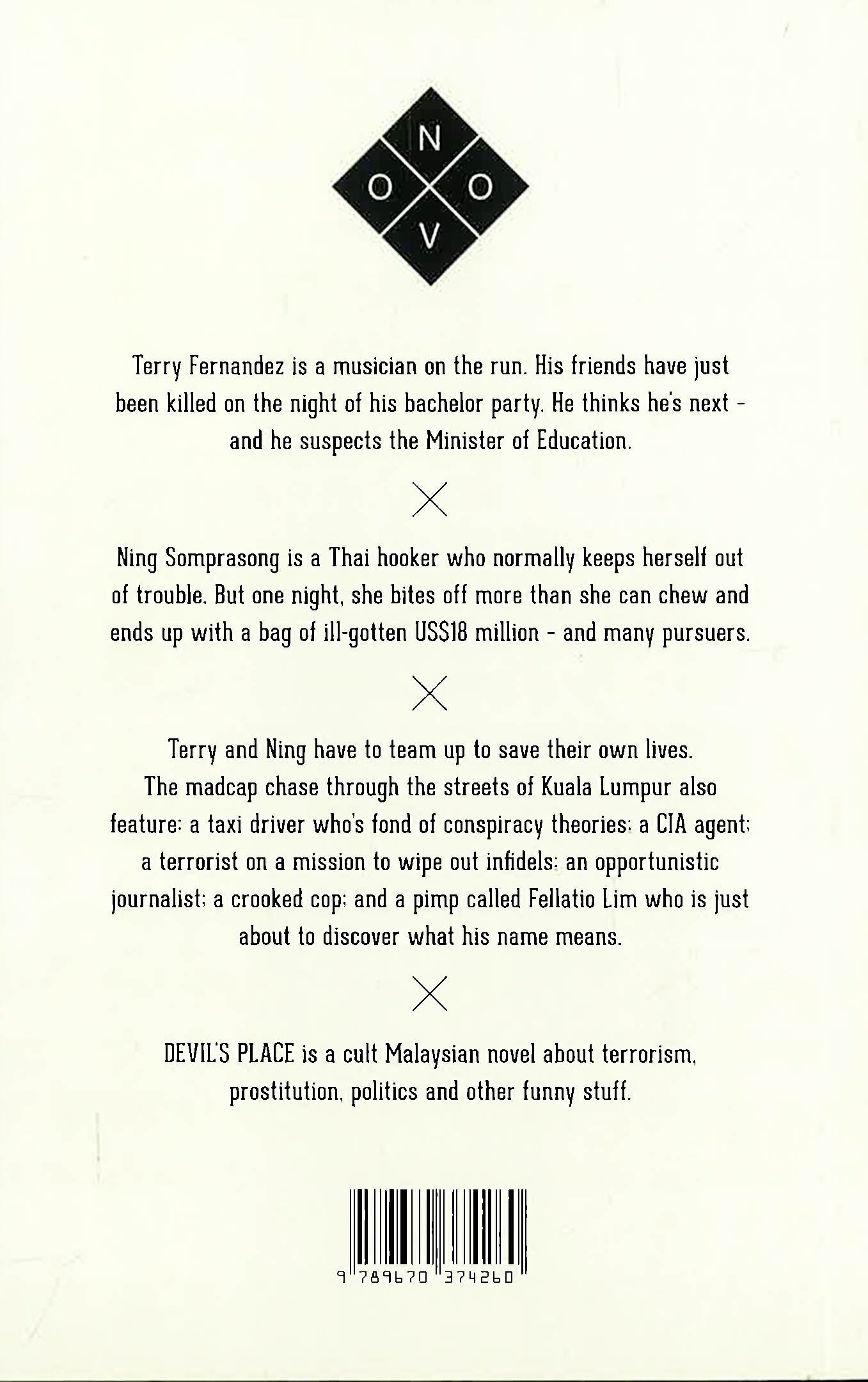 Terry Fernandez is a musician on the run. His friends have just been killed on the night of his bachelor party. He thinks he's next – and he suspects the Minister of Education. Ning Somprasong is a Thai hooker who normally keeps herself out of trouble. But one night, she bites off more than she can chew and ends up with a bag of ill-gotten US$18 million – and many pursuers. Terry and Ning have to team up to save their own lives. The madcap chase through the streets of Kuala Lumpur also feature: a taxi driver who’s fond of conspiracy theories; a CIA agent; a terrorist on a mission to wipe out infidels; an opportunistic journalist; a crooked cop; and a pimp called Fellatio Lim who is just about to discover what his name means. DEVIL'S PLACE is a cult Malaysian novel about terrorism, prostitution, politics and other funny stuff.