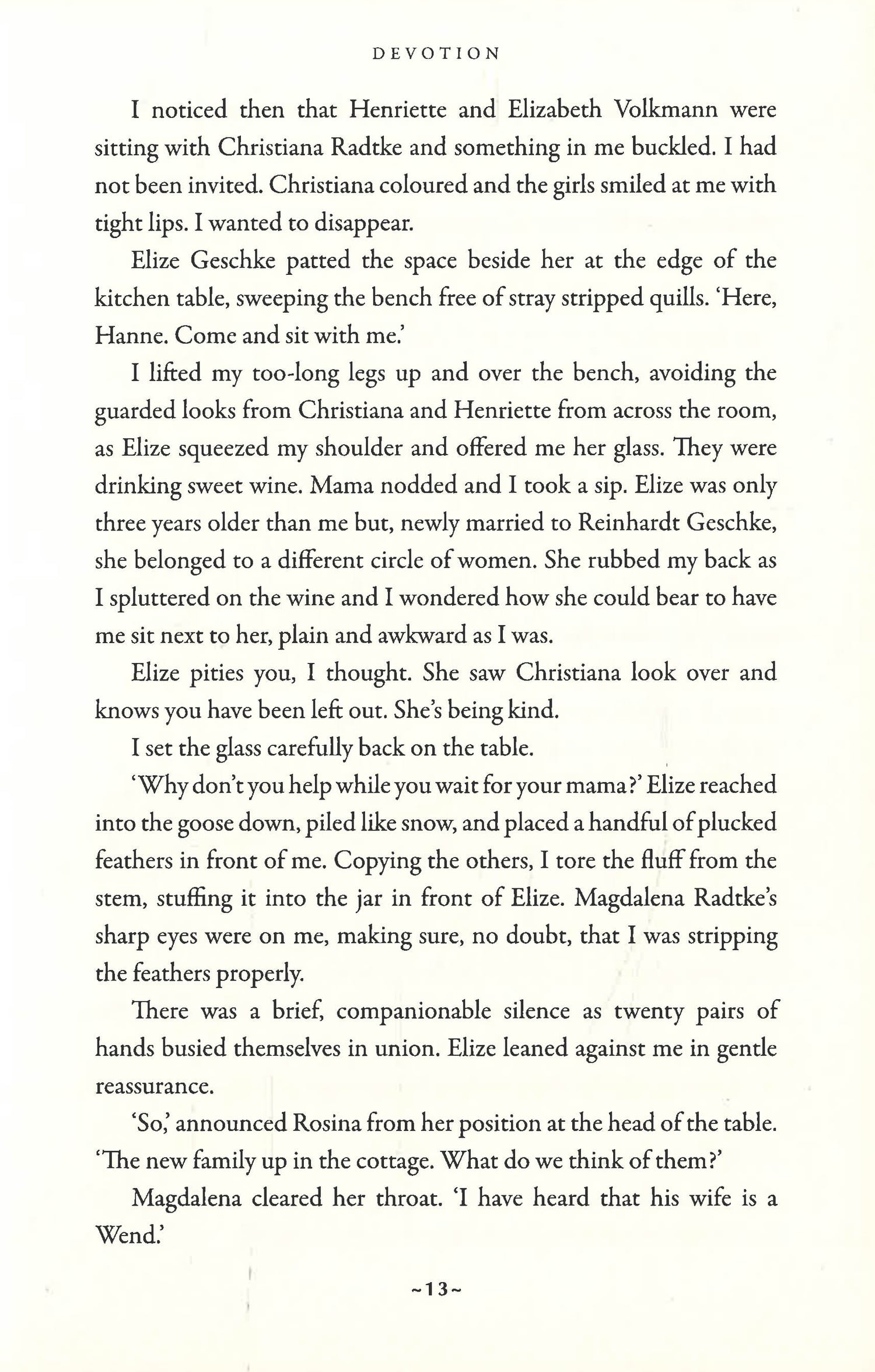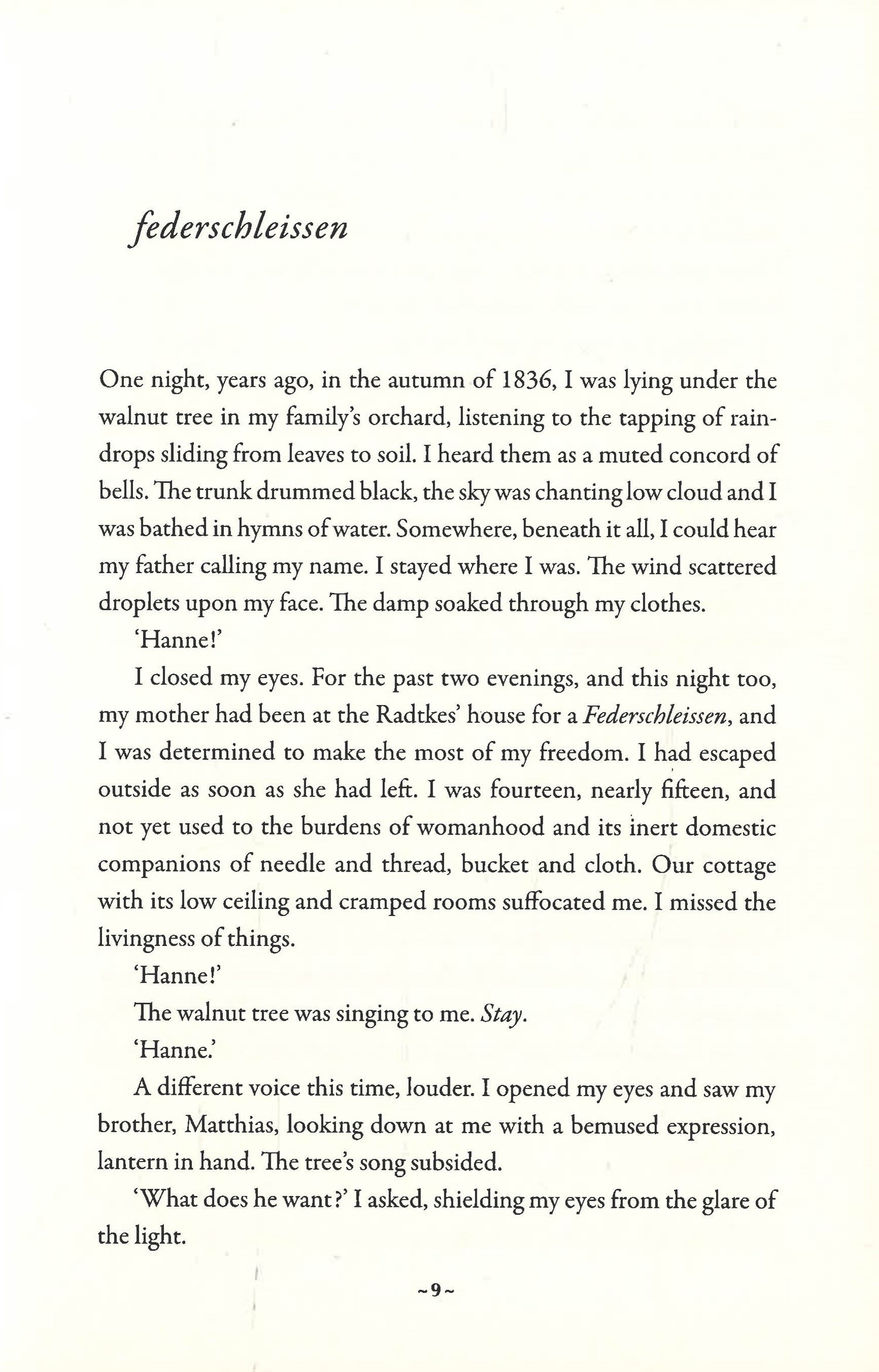 1836, Prussia. Hanne is nearly fifteen and the domestic world of womanhood is quickly closing in on her. A child of nature, she yearns instead for the rush of the river, the wind dancing around her. Hanne finds little comfort in the local girls and friendship doesn't come easily, until she meets Thea and she finds in her a kindred spirit and finally, acceptance.