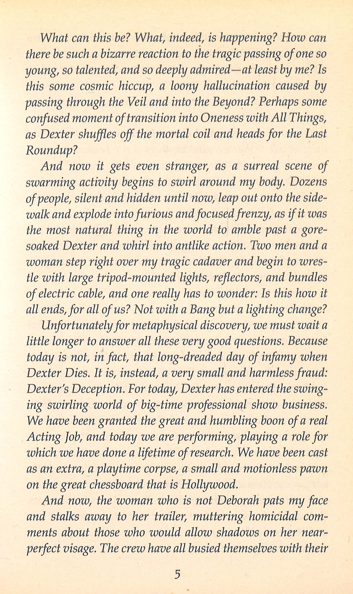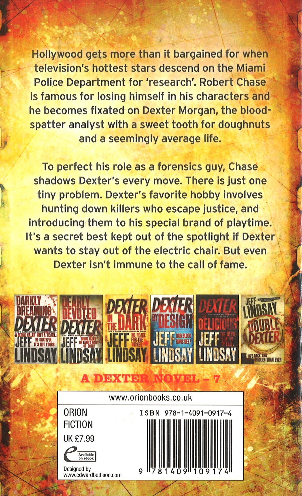 Hollywood gets more than it bargained for when television's hottest star arrives at the Miami Police Department and develops an intense, professional interest in a camera-shy blood spatter analyst named Dexter Morgan. Mega-star Robert Chase is famous for losing himself in his characters. When he and a group of actors descend on the Miami Police Department for 'research', Chase becomes fixated on Dexter Morgan, the blood spatter analyst with a sweet tooth for doughnuts and a seemingly average life. To perfect his role, Chase is obsessed with shadowing Dexter's every move and learning what really makes him tick. There is just one tiny problem ...Dexter's favorite hobby involves hunting down the worst killers to escape legal justice, and introducing them to his special brand of playtime. It's a secret best kept out of the spotlight and away from the prying eyes of bloated Hollywood egos if Dexter wants to stay out of the electric chair. The last thing he needs is bright lights and the paparazzi ...but even Dexter isn't immune to the call of fame. Jeff Lindsay's razor sharp, devilish wit, and immaculate pacing prove that he is in a class of his own, and this new novel is his most masterful creation yet.