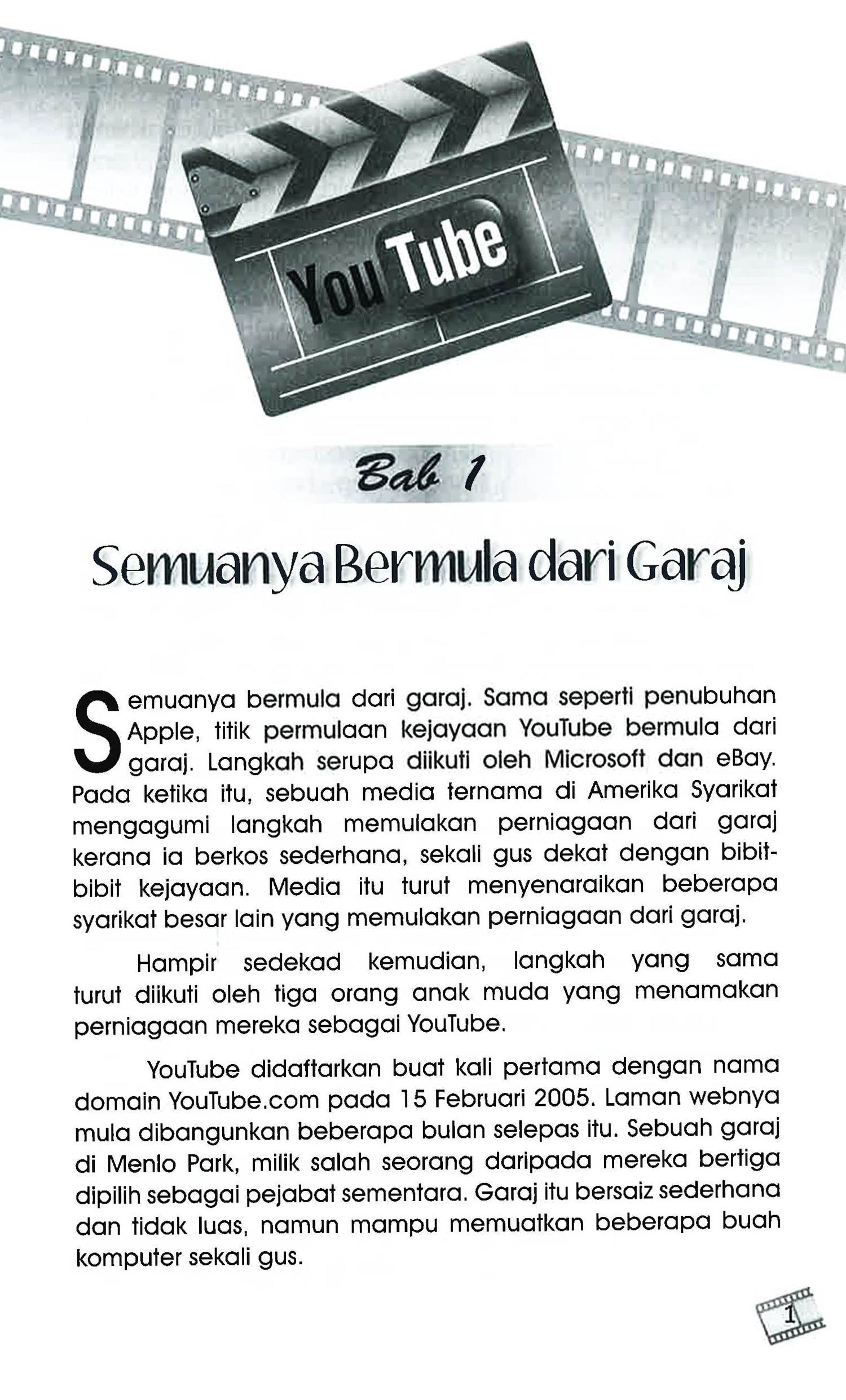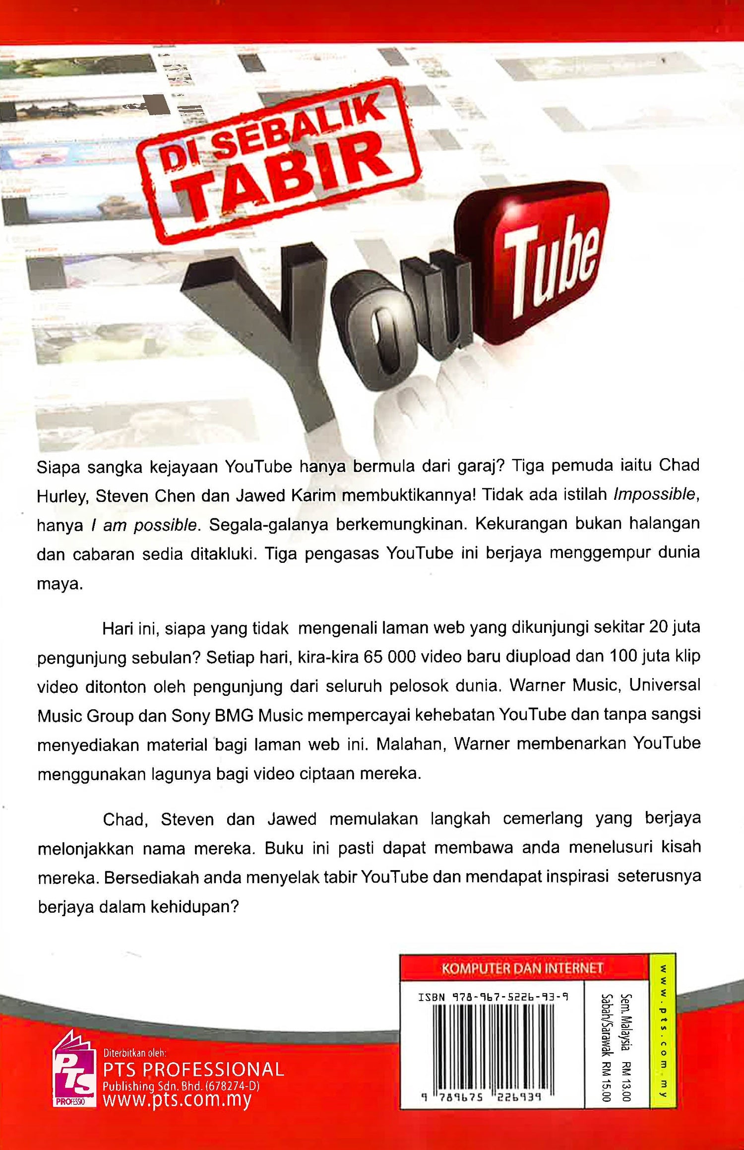 Chad, Steven dan Jawed memulakan langkah cemerlang yang berjaya melonjakkan nama mereka. Buku ini pasti dapat membawa anda menelusuri kisah mereka. Bersediakah anda menyelak tabir YouTube dan mendapat inspirasi seterusnya berjaya dalam kehidupan?