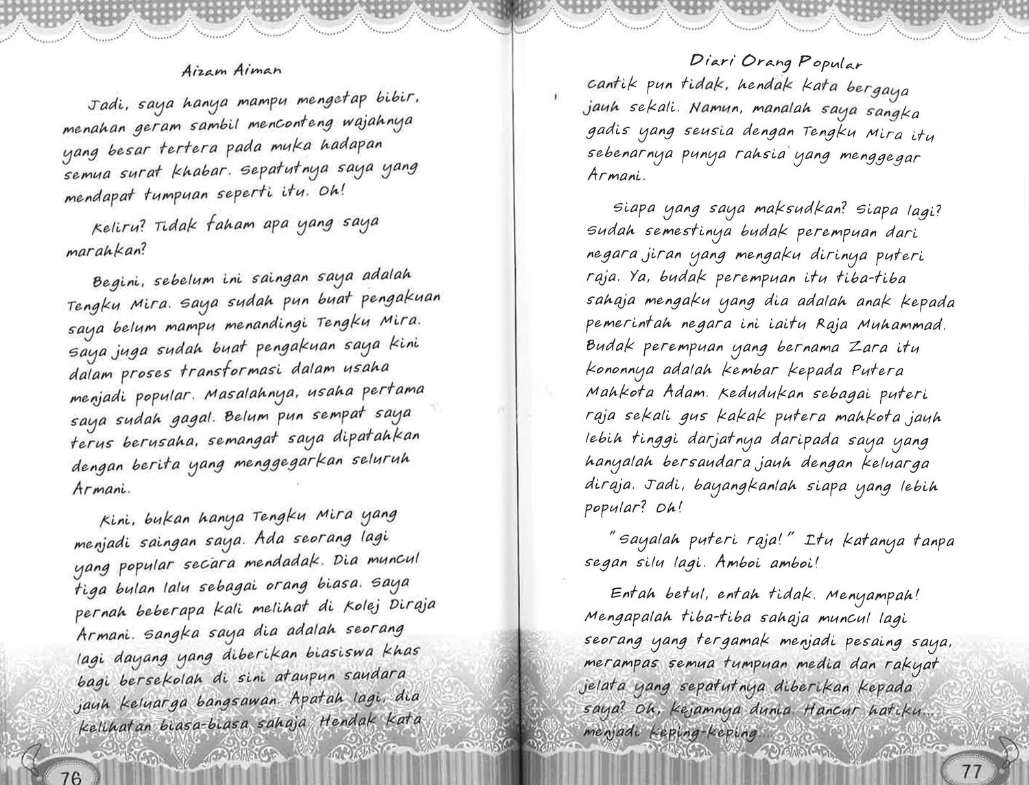 Saya memang mahu popular. Saya mahu sepopular Tengku Mira ataupun lebih popular daripada Puteri Zara. Tetapi bagaimana caranya? Saya perlukan strategi. Populariti sangat penting bagi kerabat di raja seperti saya. Saya Tengku Leah binti Tengku Zahrul, pangkal mana saya juga