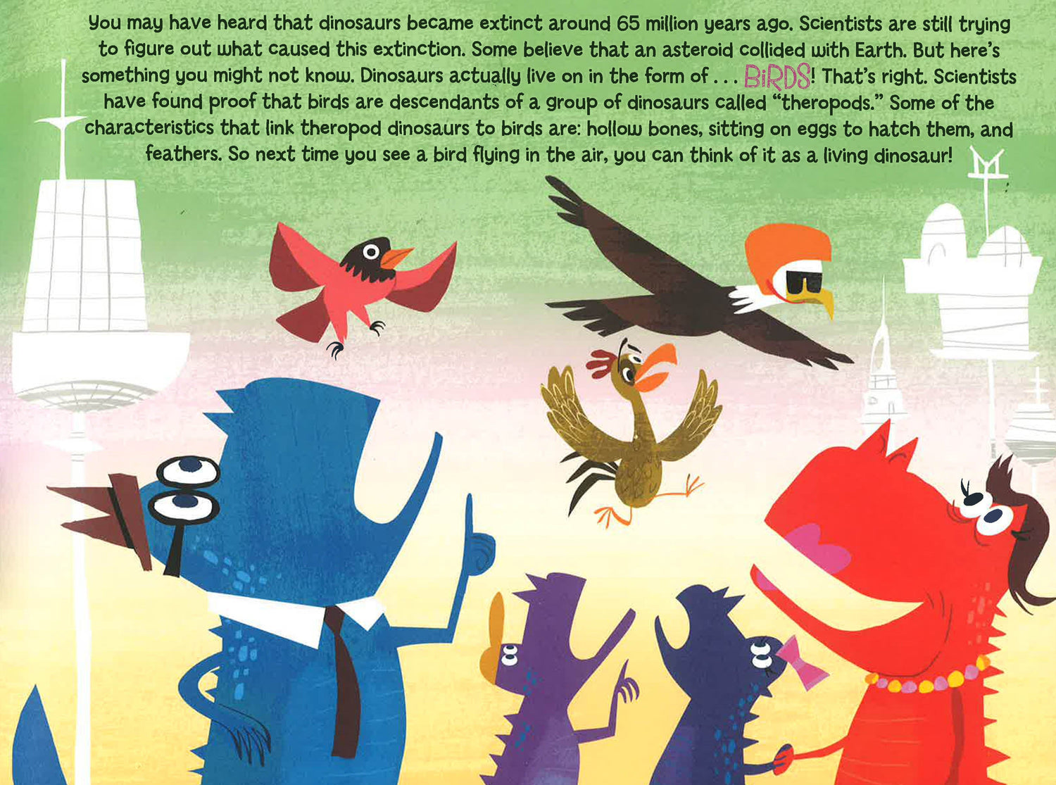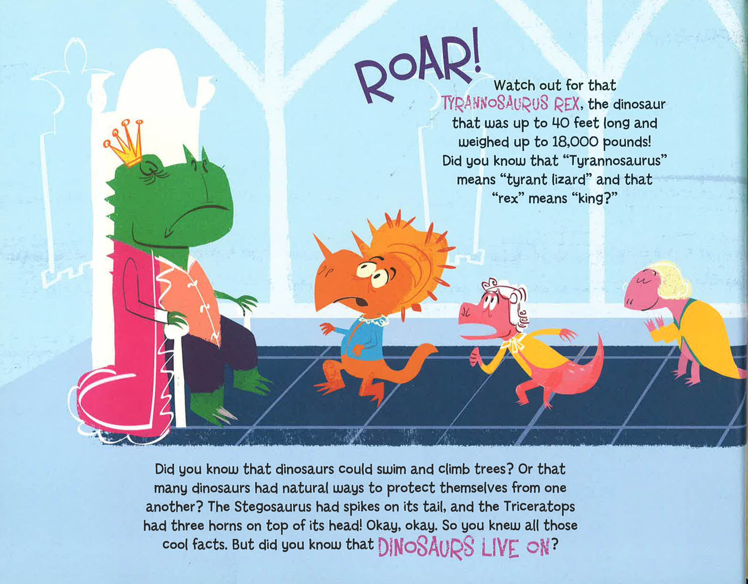 Go back in time with this dino-mite book of fun facts about fossils, pterodactyls, the T. rex, and more! Did you know that the Tyrannosaurus rex was up to forty-two feet in length? How about that the Triceratops had between 400 and 800 teeth? Or that some scientists believe that chickens are descendants of dinosaurs? Filled with tons of cool facts about dinsoaurs, plus colorful, humorous illustrations, this book is sure to be a prehistoric hit!