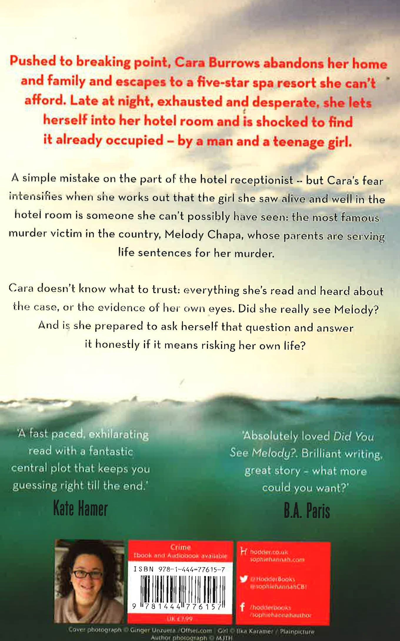 A simple mistake on the part of the hotel receptionist - but Cara's fear intensifies when she works out that the girl she saw alive and well in the hotel room is someone she can't possibly have seen: the most famous murder victim in the country, Melody Chapa, whose parents are serving life sentences for her murder.