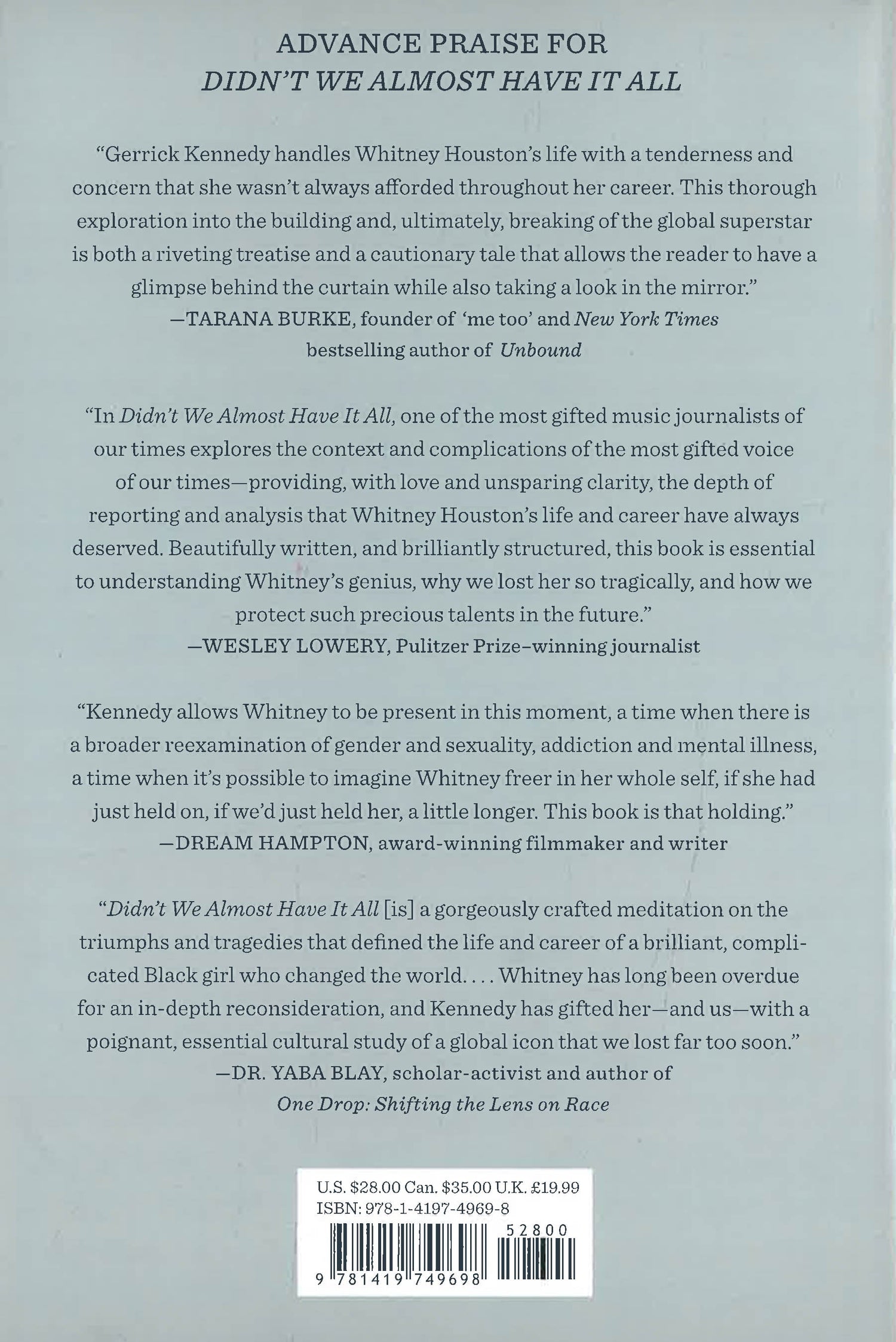 A candid exploration of the genius, shame, and celebrity of Whitney Houston a decade after her passing On February 11, 2012, Whitney Houston was found submerged in the bathtub of her suite at the Beverly Hilton Hotel. In the decade since, the world has mourned her death amid new revelations about her relationship to her Blackness, her sexuality, and her addictions. Didn’t We Almost Have It All is author Gerrick Kennedy’s exploration of the duality of Whitney’s life as both a woman in the spotlight and someone who often had to hide who she was. This is the story of Whitney’s life, her whole life, told with both grace and honesty. Long before that fateful day in 2012, Whitney split the world wide open with her voice. Hers was a once-in-a-generation talent forged in Newark, NJ, and blessed with the grace of the church and the wisdom of a long lineage of famous gospel singers. She redefined “The Star-Spangled Banner.” She became a box-office powerhouse, a queen of the pop charts, and an international superstar. But all the while, she was forced to rein in who she was amid constant accusations that her music wasn’t Black enough, original enough, honest enough. Kennedy deftly peels back the layers of Whitney’s complex story to get to the truth at the core of what drove her, what inspired her, and what haunted her. He pulls the narrative apart into the key elements that informed her life―growing up in the famed Drinkard family; the two romantic relationships that shaped the entirety of her adult life, with Robyn Crawford and Bobby Brown; her fraught relationship to her own Blackness and the ways in which she was judged by the Black community; her drug and alcohol addiction; and, finally, the shame that she carried in her heart, which informed every facet of her life. Drawing on hundreds of sources, Kennedy takes readers back to a world in which someone like Whitney simply could not be, and explains in excruciating detail the ways in which her fame did not and could not protect her. In the time since her passing, the world and the way we view celebrity have changed dramatically. A sweeping look at Whitney’s life, Didn’t We Almost Have It All contextualizes her struggles against the backdrop of tabloid culture, audience consumption, mental health stigmas, and racial divisions in America. It explores exactly how and why we lost a beloved icon far too soon.