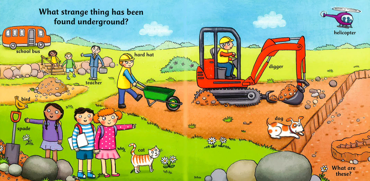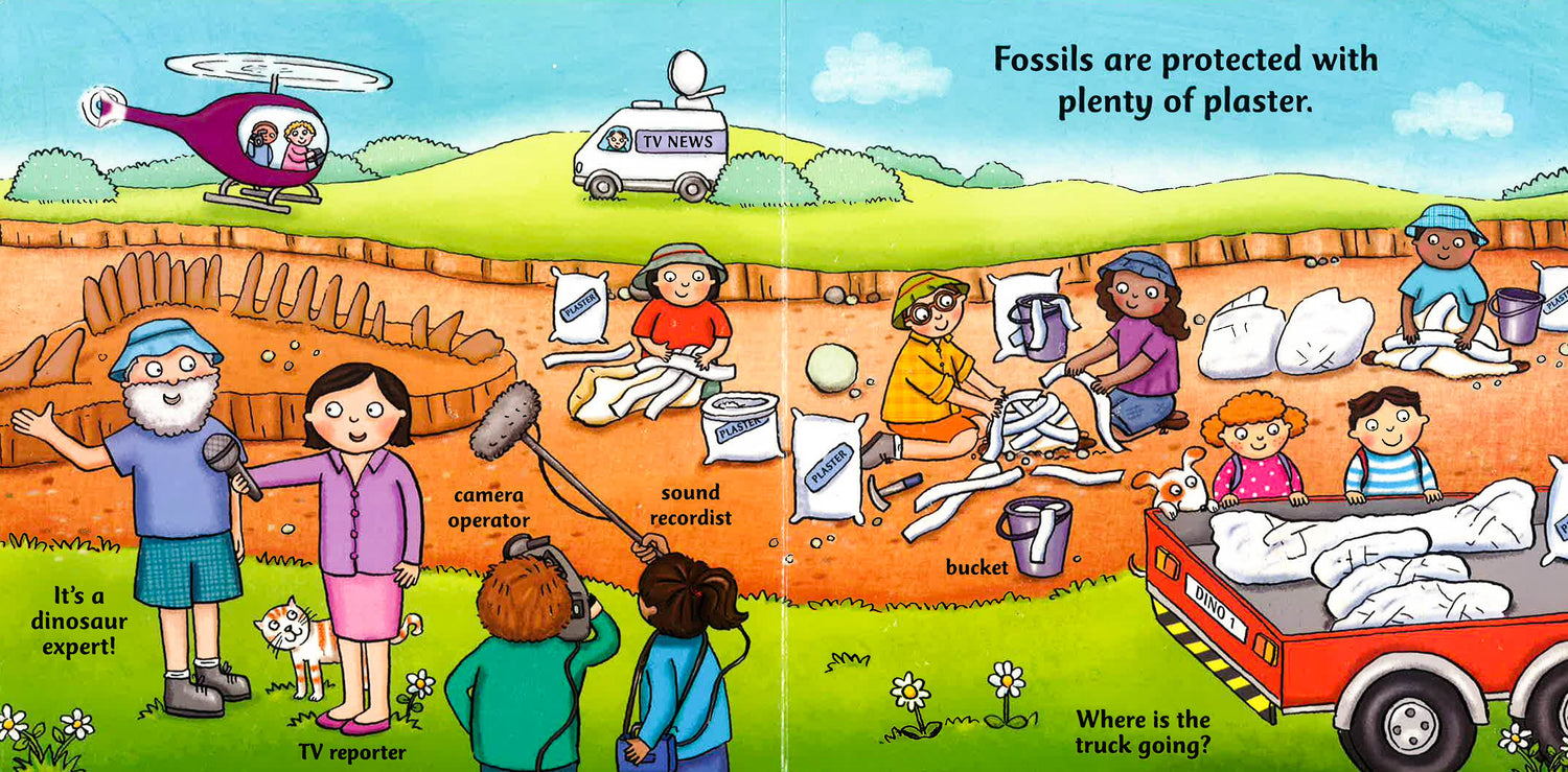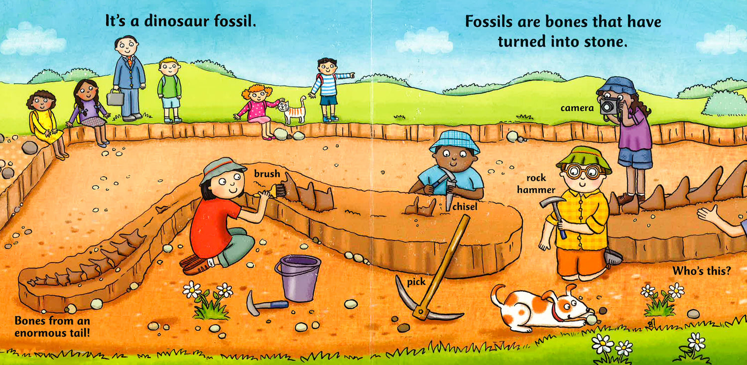 What strange thing has been found underground? A really cool dinosaur bone! Kids can discover exactly what a fossil is, how they're cleaned and protected, and how scientists study them to learn more about these prehistoric creatures. At the end, a really long foldout presents a complete dinosaur skeleton to see!