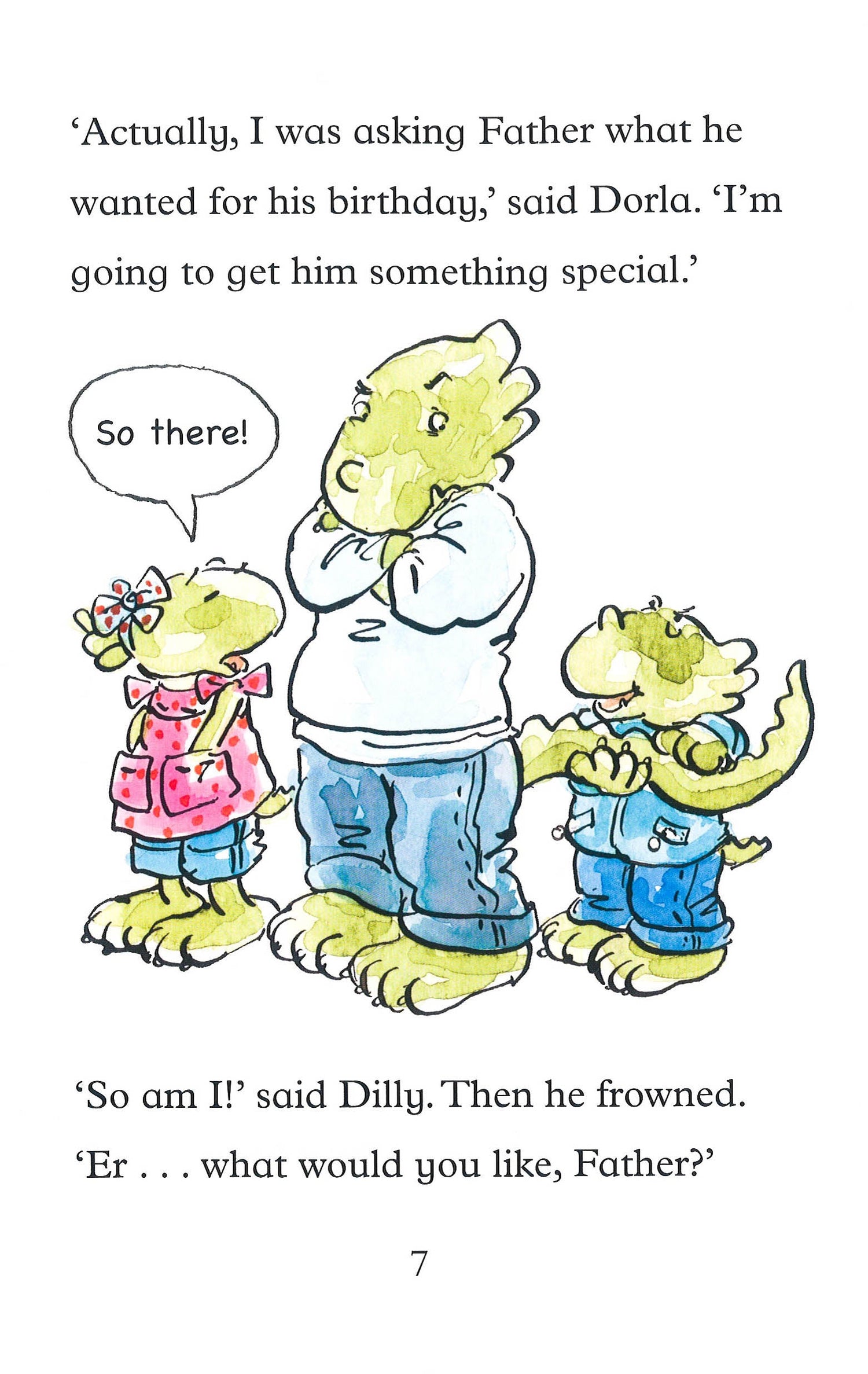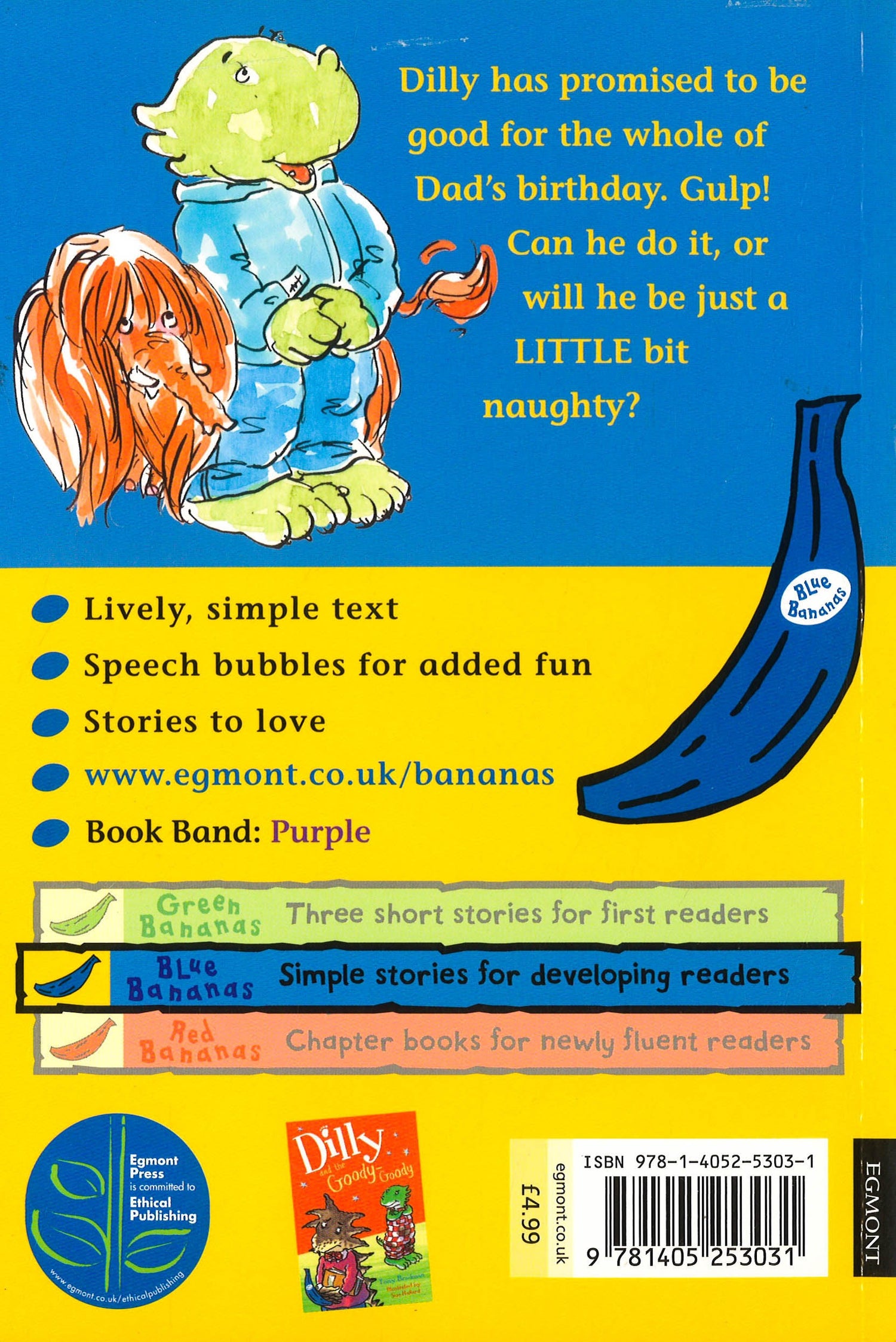 A funny, cheeky story about one very naughty little dinosaur by Tony Bradman for Egmont's blue banana series. It's Dad's birthday and Dorla has already got him a present. Dilly has nothing to give him but Dad says that all he wants is for Dilly to be good for the day. The challenge is on! Can Dilly be good for one whole day? It's going to be tough, especially with a sister determined to make him snap ...Sure to entrance all beginner readers with its humour and fabulous illustrations! Blue bananas are chapter books for children learning to read, suitable for NC Level 2 readers. They are carefully designed educational books for children, supporting their understanding of how to read and develop vocabulary. Blue bananas uses speech bubbles to aid understanding of dialogue and the text encourages children to explore the feelings of characters.