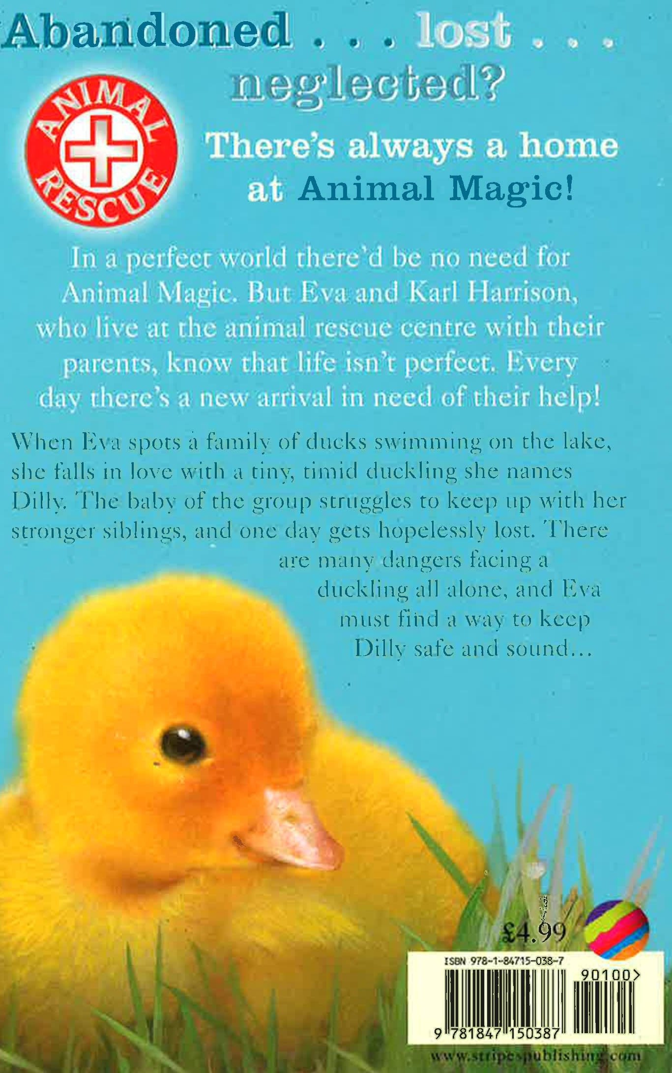 In a perfect world there'd be no need for Animal Magic. But Eva and Karl Harrison, who live at the animal rescue centre with their parents, know that life isn't perfect. Every day there's a new arrival in need of their help...When Eva spots a family of ducks swimming on the river, she falls in love with a tiny, timid duckling she names Dilly. The baby of the group struggles to keep up with her siblings, and one day gets hopelessly lost. Can Eva help to keep her safe?