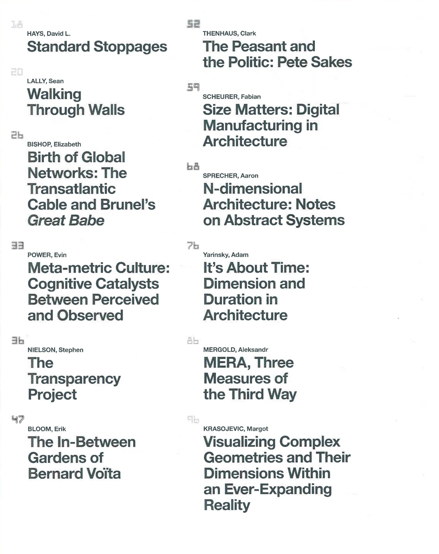 306090 has emerged as an essential forum for issues of architectural practice and theory. Each volume addresses a pressingissue and offers diverse, cross-disciplinary solutions in the form of projects, ideas, buildings, and other media. Dimension (306090 12) reconsiders the act of measurement and definition in architectural design practice. Architecture in the past two decades has been transformed by the ongoing revolution in digital design and fabrication techniques. Dimension explores how the data, design, and invention derived from the act of measurement can help architects respond to economic, political, and environmental factors.