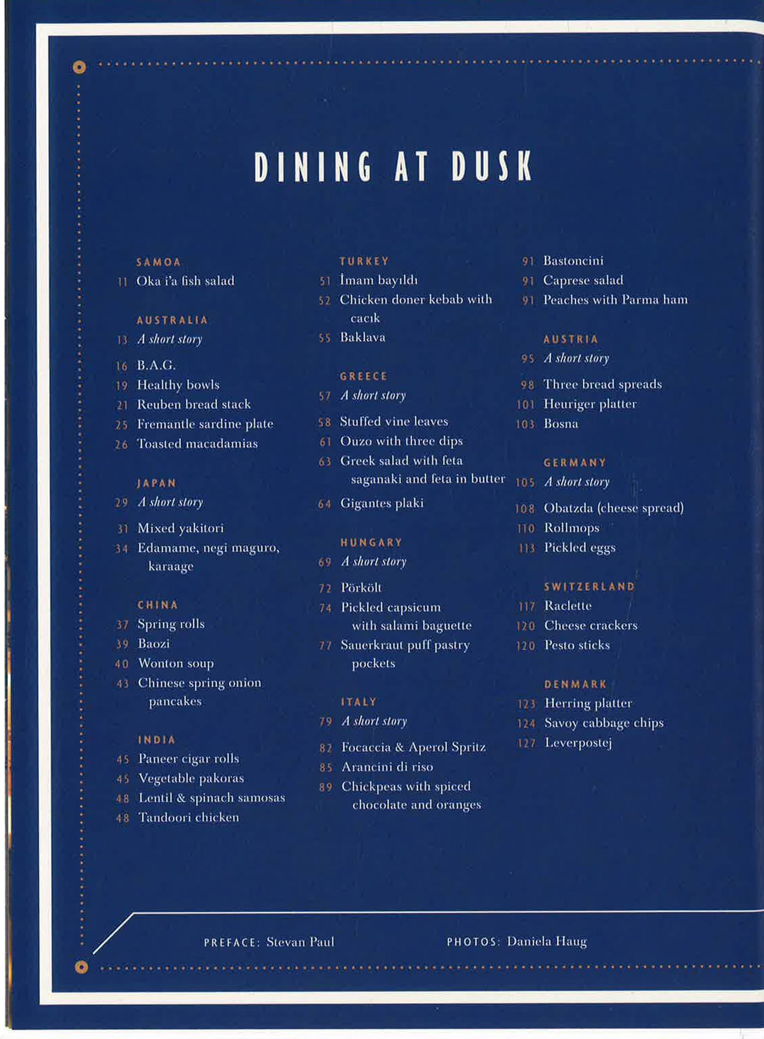 At dusk, as afternoon relaxes into evening and the sun sinks towards the horizon, there is a magic moment. The work day is finally done, and it's time for food and drinks with friends. Dining at Dusk follows the golden hour around the globe - from Samoa, where the sun sets first, through Australia, Japan, India, Europe, Morocco and Brazil, to the USA and Mexico - celebrating the evening with Italian cicchetti, Spanish tapas, Greek mezzes, with tacos, yakitori, ceviche and more. Simple-to-prepare recipes with roots in local culinary and cultural traditions, each paired with the ideal drink and a thoughtfully curated playlist - this is the perfect cookbook for elegant, laid-back gatherings with friends. Dining at Dusk showcases a range of contemporary cuisine from around the world for this beautiful time of the day: relaxed, simple, comforting inspiration for food that is the ideal accompaniment to a modern lifestyle.