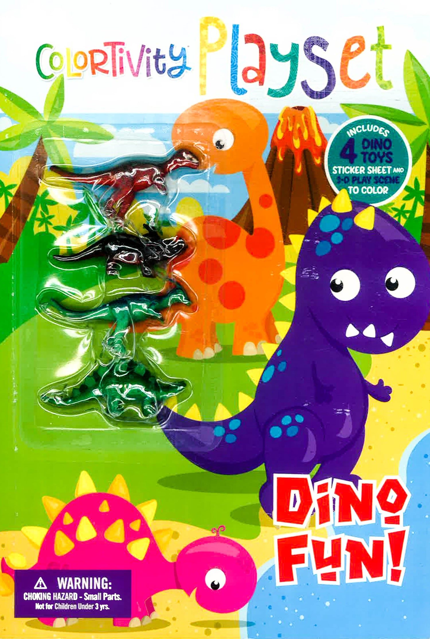 This 64-page dinosaur coloring and activity book brings lots of extra play value! It includes 4 plastic mini dinosaurs, a cardstock pull-out spread to color and create a background for a dinosaur play scene, and 1 sheet of stickers.