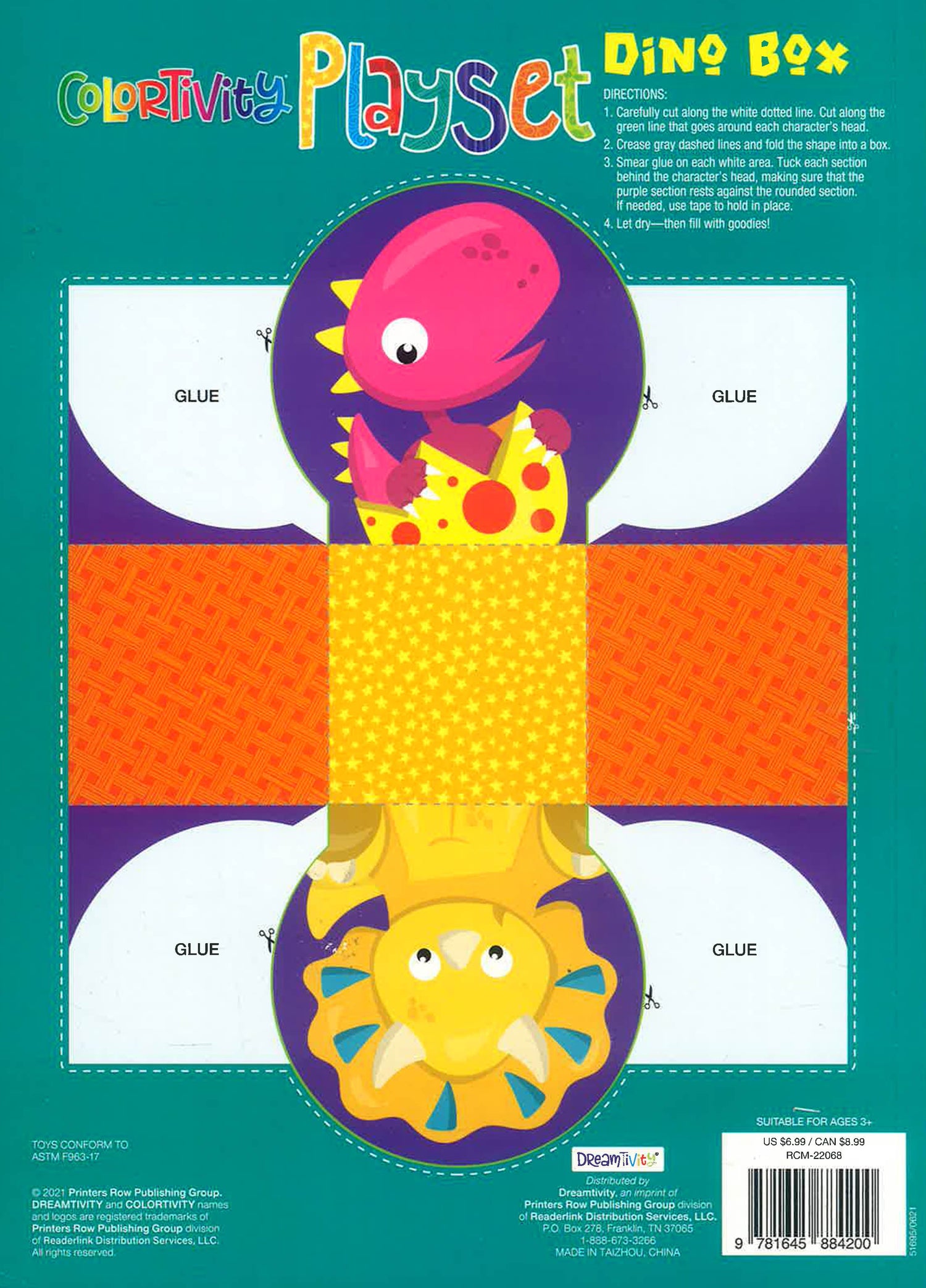Kids who like dinosaurs will get hours of playtime from this 64-page coloring and activity book filled with prehistoric beasts. To spark imaginative play and stories, 4 mini dinosaur toys are blistered to the front (a Tyrannosaurus rex, styracosaurus, parasaurolophus, and stegosaurus). And the book features a full-spread, color-your-own cardstock scene to use with the toys. A sheet with 33 stickers is also included! Plus, the back cover offers a small cut-out and fold box to hold the dinosaur toys or other small keepsakes. Perforated pages make it easy for kids to tear out and display their artwork.