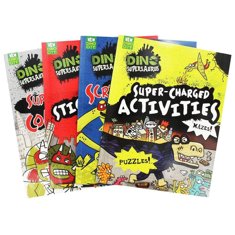 Kaboom! The Heroic Dino supersaurs explode into your world with 4 Dino-powered activity books in 1 super-charged pack!