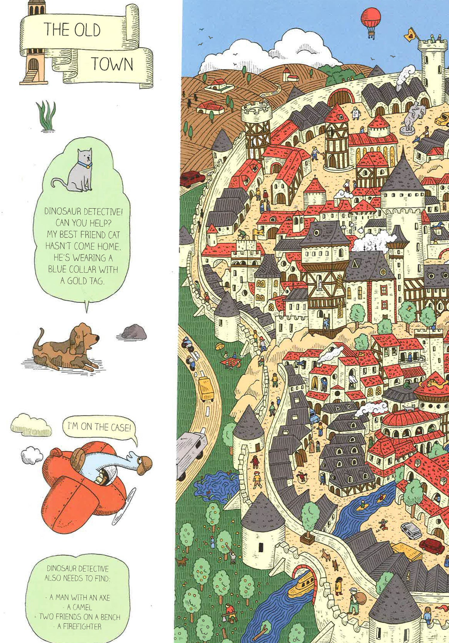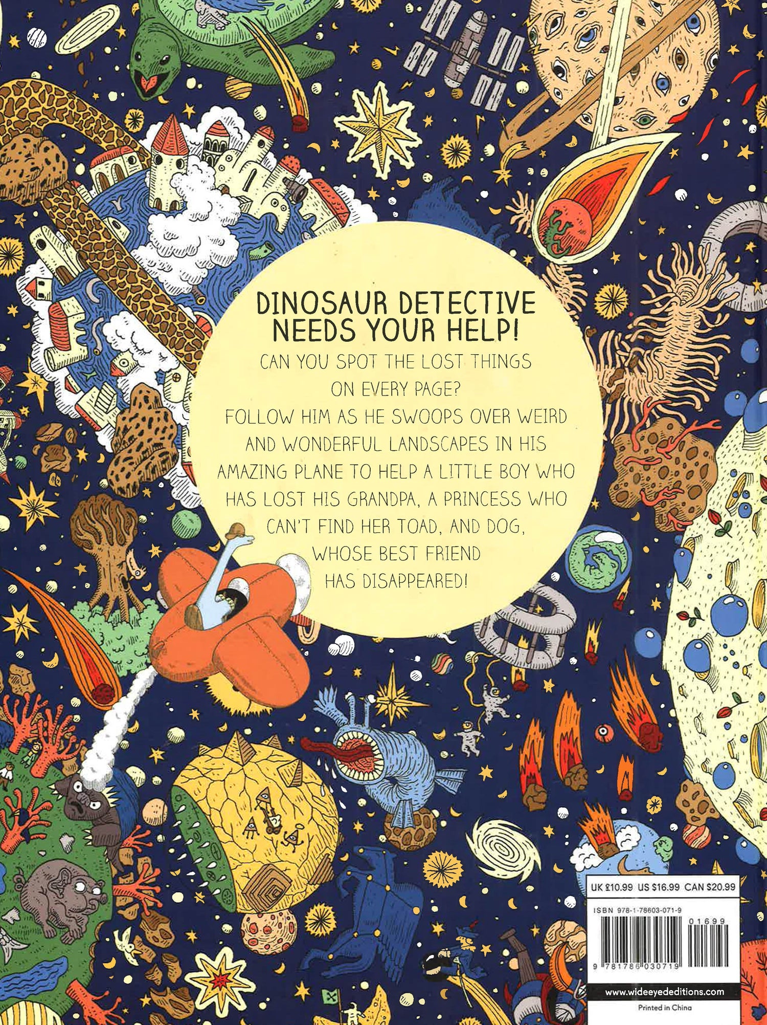Jump aboard the red aeroplane with Dinosaur Detective and travel the world in search of lost animals and people. From the jungle to the stormy sea to outer space, test your spotting skills in this puzzle-packed tour of a dozen different destinations. Kids will love this mystery hide-and-seek spotting adventure with a flying dinosaur detective!