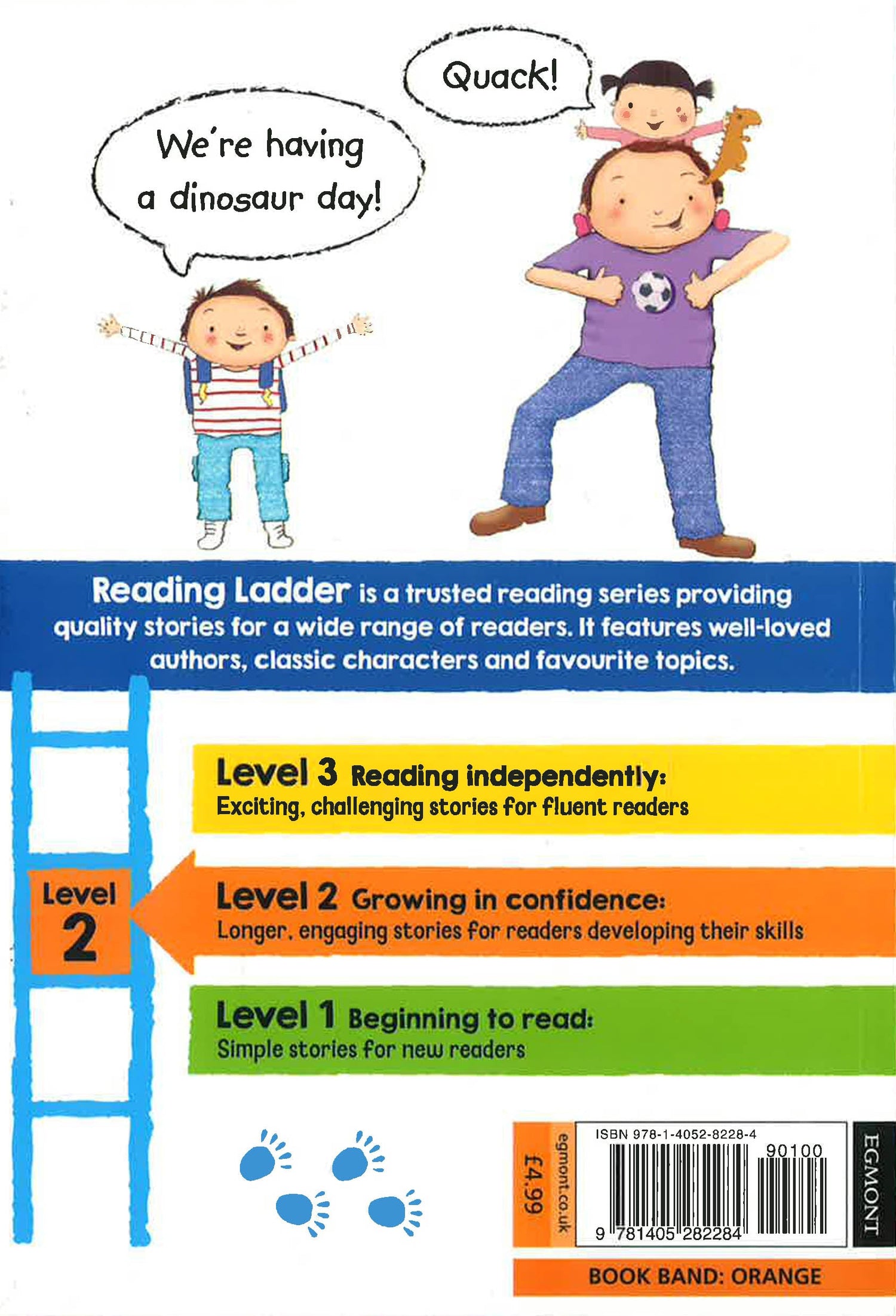 A fun and lively dinosaur story of prehistoric preportions, perfect for children learning to read. Sam and his little sister Rosa are having a dinosaur day with Dad. They see the dinosaur eggs at the museum, colour in some dinosaur pictures and make dinosaur biscuits. It's a lot of fun, but somehow there's always a dinosaur disaster just waiting to happen. The Reading Ladder series helps children to enjoy learning to read. It features well-loved authors, classic characters and favourite topics, so that children will find something to excite and engage them in every title they pick up. It's the first step towards a lasting love of reading. Level 2 Reading Ladder titles are perfect for readers who are growing in confidence and are beginning to enjoy longer stories. " Clear type " Up to 8 lines per page " Bright, appealing pictures for added interest " A variety of sentence structures " A wider range of vocabulary " Strong themes and characters to discuss All Reading Ladder titles are developed with a leading literacy consultant, making them perfect for use in schools and for parents keen to support their children's reading. Book band: Orange