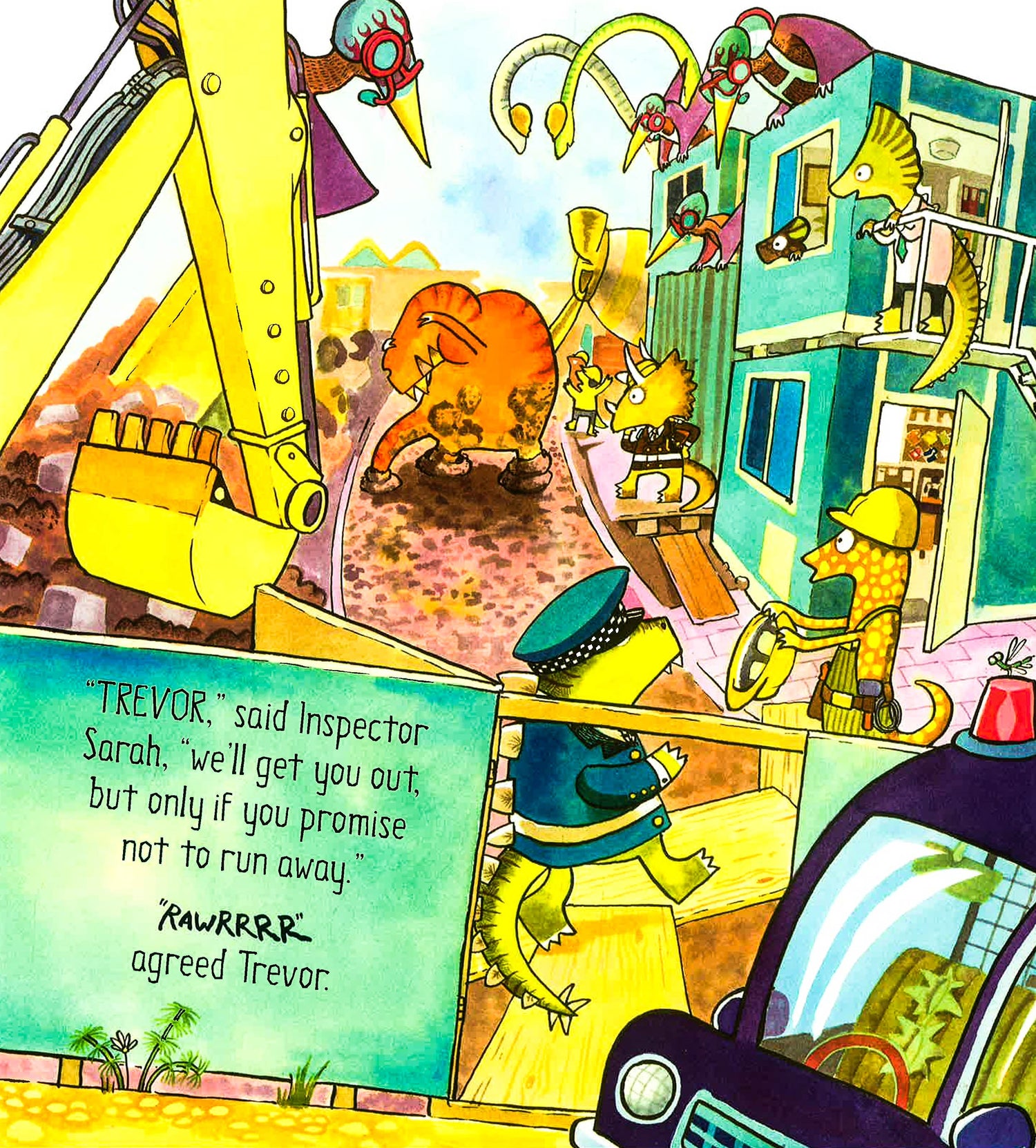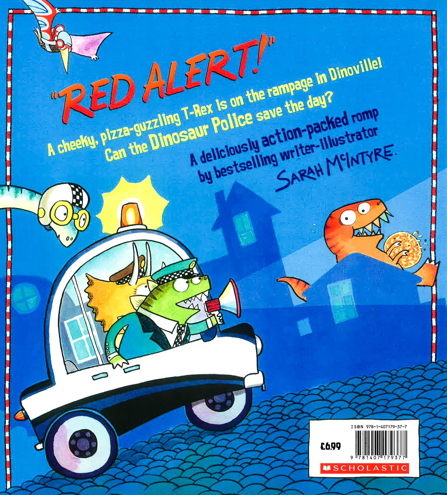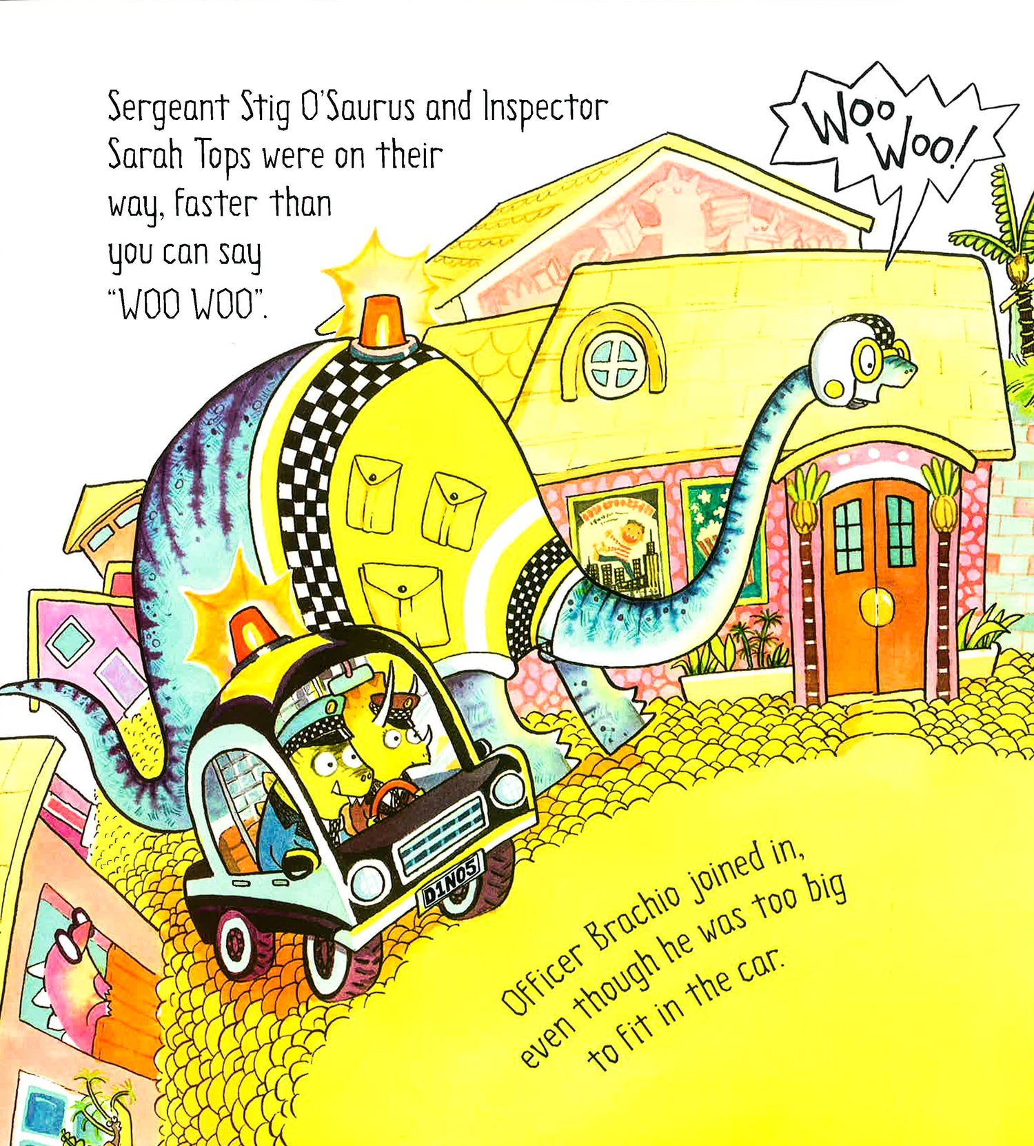 "Red alert!" hollered Sergeant Stig O'Saurus. "There's a rampaging T-Rex at the pizza factory!" The dino police hop in their vehicles and switch on their sirens faster than you can say "WOO WOO!"