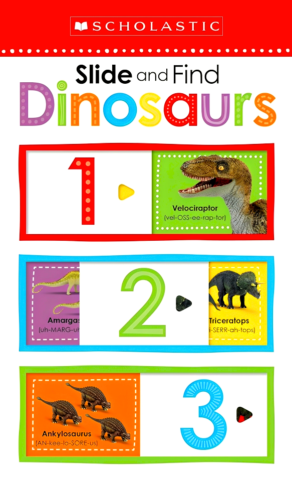 From Scholastic Early Learners comes a interactive book all about dinos and counting!With vivid images and fun, slide-and-find pictures, children will love exploring Slide and Find Dinosaurs while practicing their numbers and learning about dinosaurs! Each page of this entertaining book features easy-to-use sliders that move to reveal different dinosaur pictures with a special focus on the numbers 1 to 10. The moveable sliders have small finger holes revealing a portion of the picture underneath. This encourages children to interact with the book and helps develop children's hand-eye coordination skills while they have fun learning to count.Scholastic Early Learners: Interactive books for hands-on learning. Perfect for babies, toddlers, preschoolers, kindergarteners, and first graders, too!