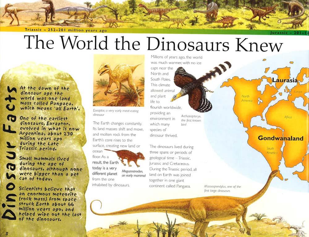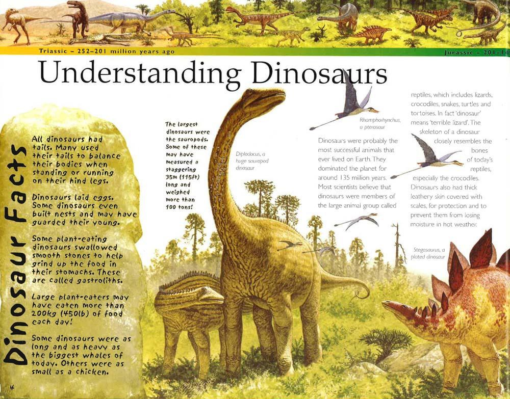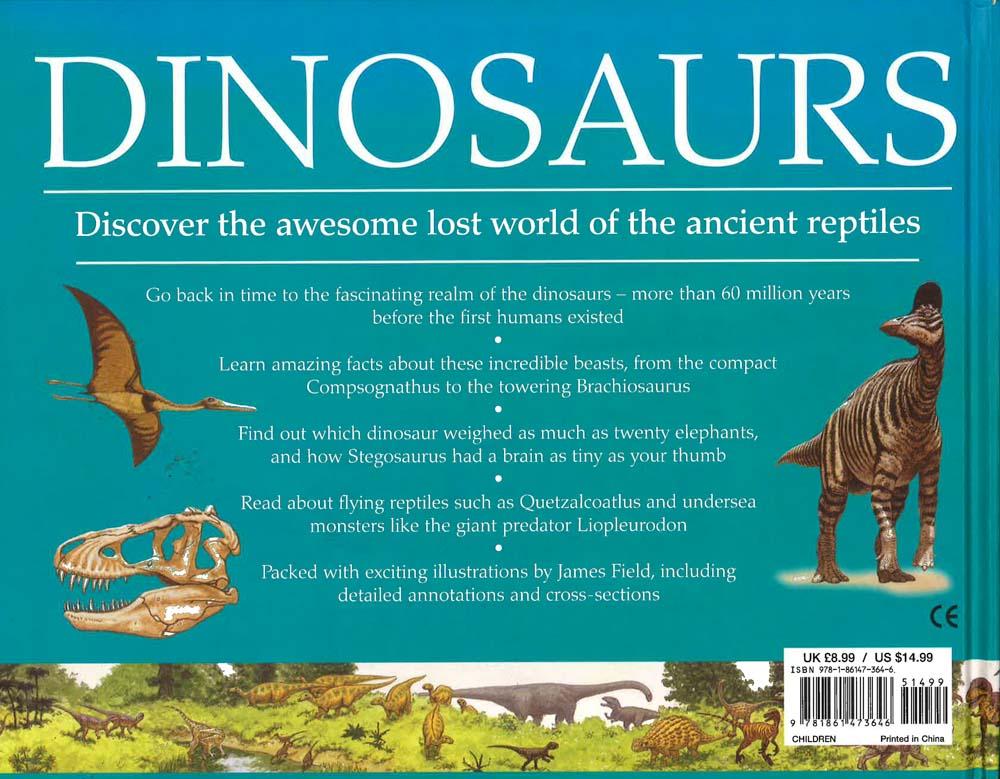 This title helps you discover the awesome lost world of the dinosaur. You can go back in time to the fascinating realm of the dinosaurs - more than 60 million years before the first humans existed. It features information-packed landscape pages, suitable for both home and school use. Special feature boxes provide incredible dinosaur facts and figures. There is outstanding artwork throughout, including detailed annotations for the budding dino expert. It is a book that children will want to read again and again. This beautifully illustrated reference book is essential reading for every child with an interest in dinosaurs. It helps them discover amazing facts about these incredible beasts, from the compact Compsognathus to the towering Brachiosaurus. You can find out which dinosaur weighed as much as twenty elephants, and how Stegosaurus had a brain as tiny as your thumb. You can learn about flying reptiles such as Quetzalcoatlus and undersea monsters like the giant predator Liopleurodon. The thematically written text answers many of the questions that children ask, such as "what were dinosaurs really like?" and "why did the dinosaurs die out?" Expertly written, this book reveals the mysteries of how these animals dominated the planet Earth for 160 million years.