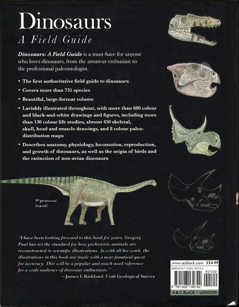 This is a large format field guide (a playful notion) to the true dinosaurs - the Tetrapoda (no pterosaurs or marine reptiles). Dinosaur taxonomy is complex and contentious, and while more than 1500 species have been claimed, many records are based on partial remains or are without adequate scientific documentation. The author recognises 600+ species. An extensive introduction treats a wide range of topics from taxonomy, evolution, biology and behaviour to a discussion of fossil discoveries and paleontological research. The bulk of the book is devoted to full treatment of the five dinosaur groups: protodinosaurs; predatory dinosaurs and protobirds; prosauropods; sauropods; and ornithiscians. After each family introduction, the species text includes biometrics, fossil remains (proportion of full animal recovered and sites at which specimens have been found), age, distribution and formations, habitat (where known), and habits (mainly based on anatomical features). The level of knowledge about species varies considerably and this is fully reflected in the species accounts. Many of the species descriptions are accompanied by black-and-white anatomical reconstructions and/or skull diagrams as well as numerous colour renderings of the complete animal. There are also supplementary illustrations - eggs, trackways, herds, juveniles and so forth - and evocative colour and black-and-white 'scenes' of dinosaur behaviour.