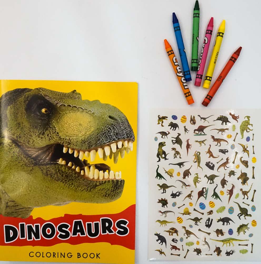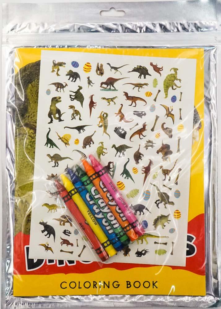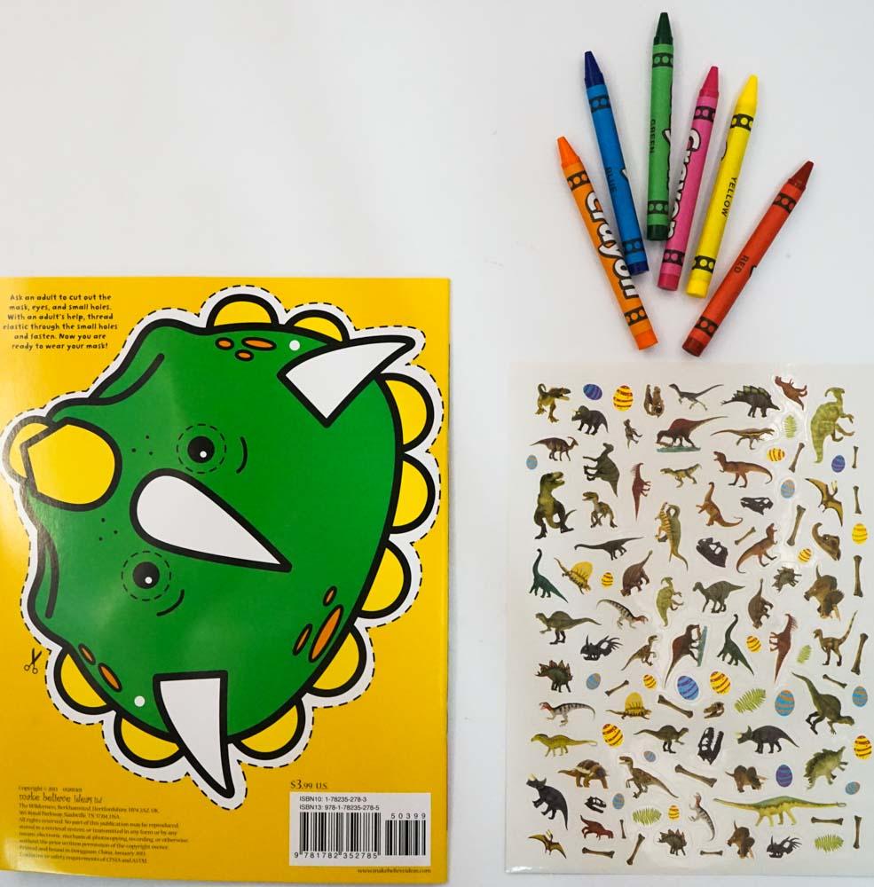 Each bag contains a pack of 6 crayons, a mini coloring book, a mask, and a sheet of bright stickers to use wherever you want!