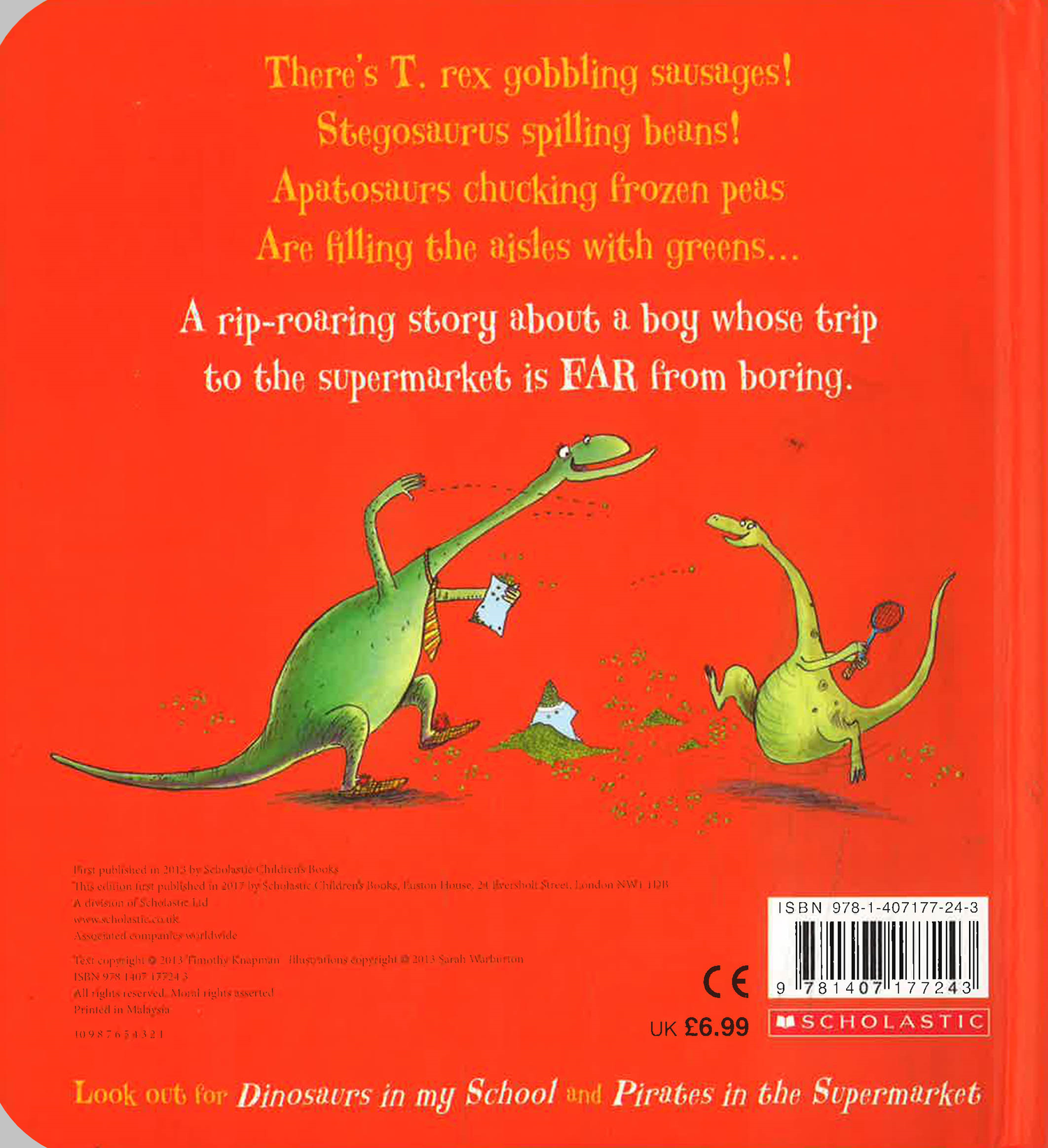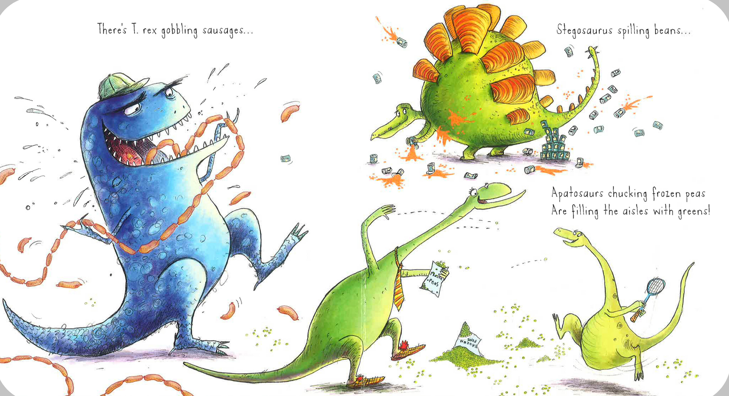 A chunky gift-edition board book of a bestselling dinosaur romp!There’s a T. rex gobbling sausages,a Stegosaurus spilling beans! A Diplodocus in the frozen peasfills the aisles with greens!