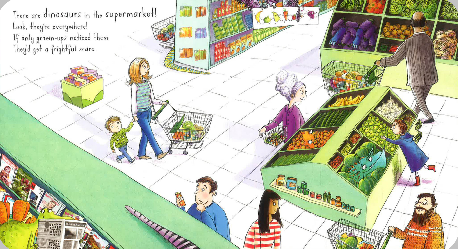 For one little boy, a trip to the supermarket is turned upside down. A band of dinosaurs wreak havoc in the aisles, but the grown-ups can’t see them! Can he convince the dinosaurs to behave? And, more importantly, who will mop up the mess?