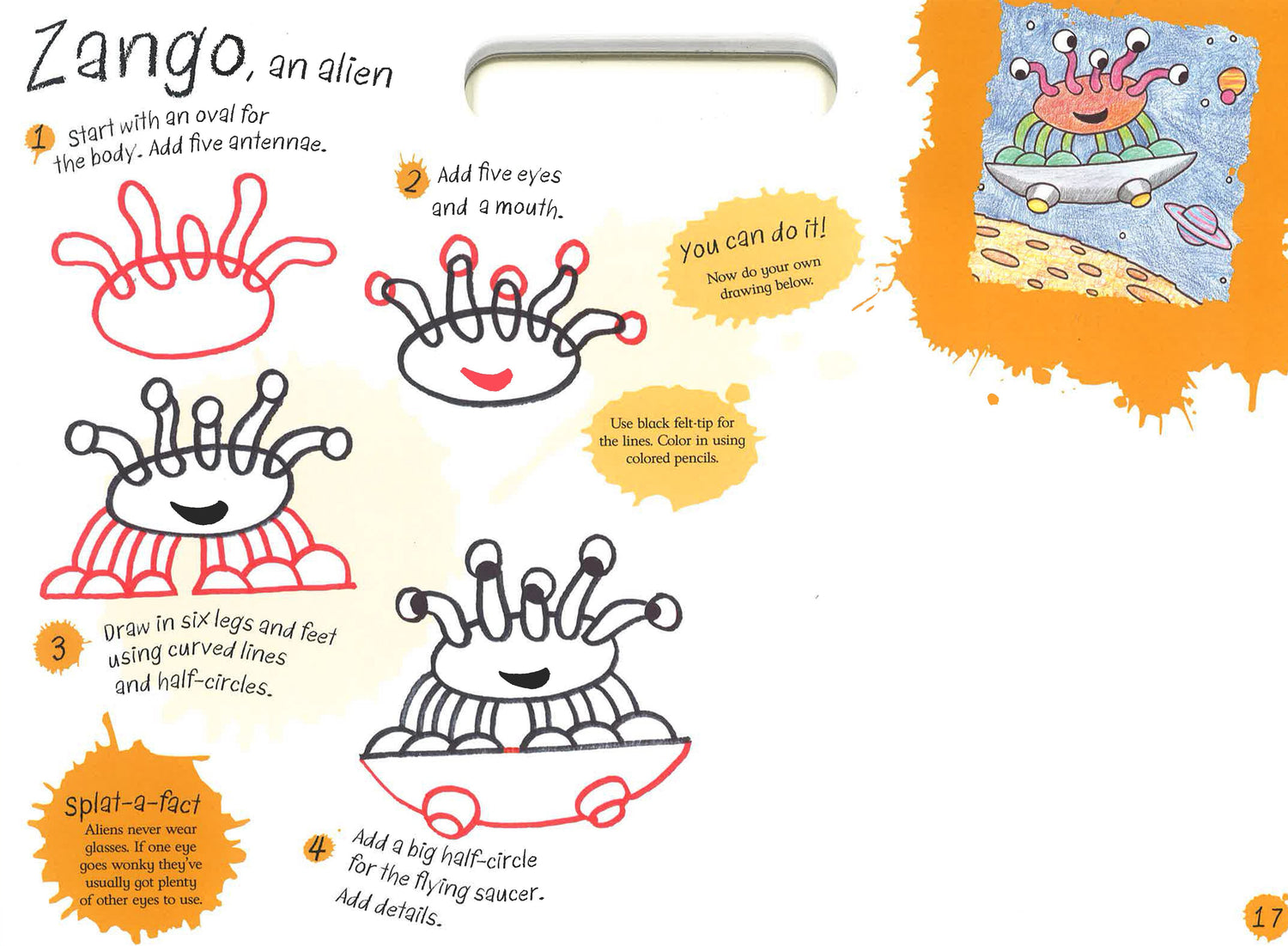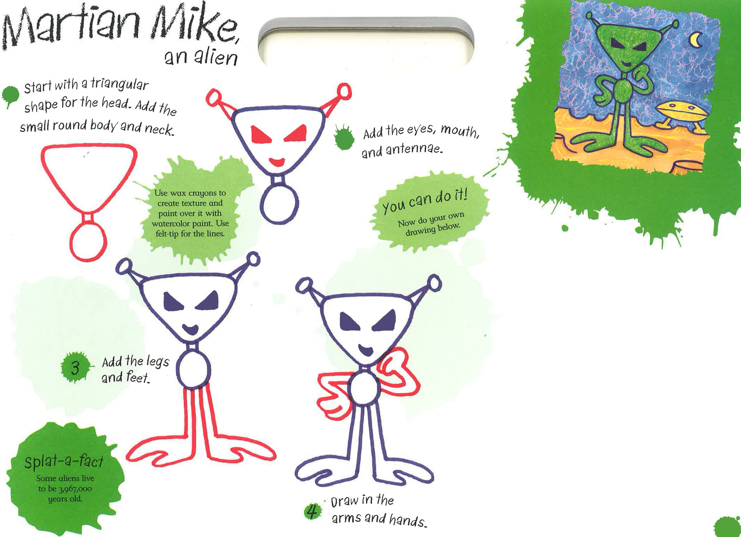 Kids can do it - create imaginative pictures of their favorite creatures, like an iguanodon and Rivet the Robot. With its step-by-step instructions, "splat-a-facts" to guide and encourage, and large-format pad, this drawing book will spark creativity. Kids will learn to use a variety of materials, from wax crayons to ink pens, and master simple artistic concepts, including coloring, making shapes, shading, and erasing. Plus, the pad has a handle, so you can take it wherever you go!