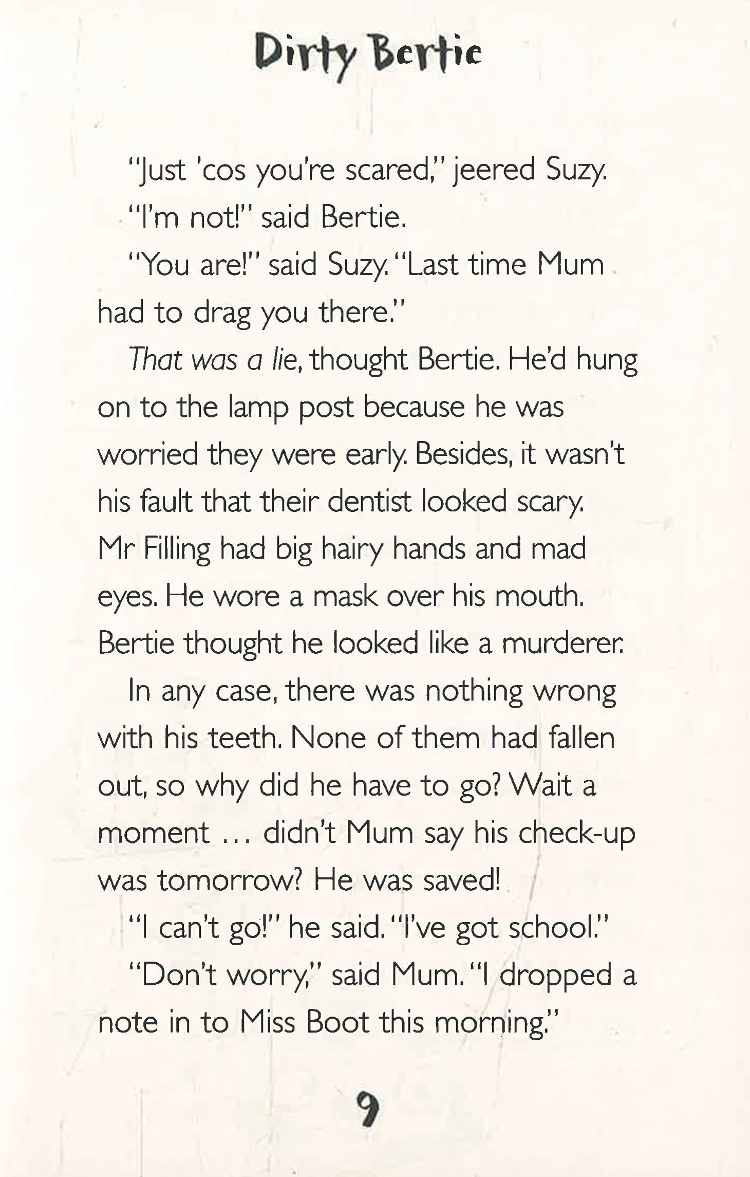 Calling all Dirty Bertie fans! Dirty Bertie - the boy with nose-pickingly disgusting habits - is back for another helping of comic chaos! More disgusting than ever, with crazier plans and increasingly madcap schemes, Bertie continues to delight his legions of fans who revel in his revolting ways. Join Bertie on his 19th adventure in Toothy! as he takes a reluctant trip to the dentist, tries to keep his cool on the hottest day of the year, and causes a mid-air emergency whilst flying with a very nervous Dad! Dirty Bertie is a hugely popular series created by David Roberts. With each hilarious story approximately thirty pages long and split into chapters, Dirty Bertie is ideal for reluctant boy readers or readers in search of hilarity but with a short attention span.show more