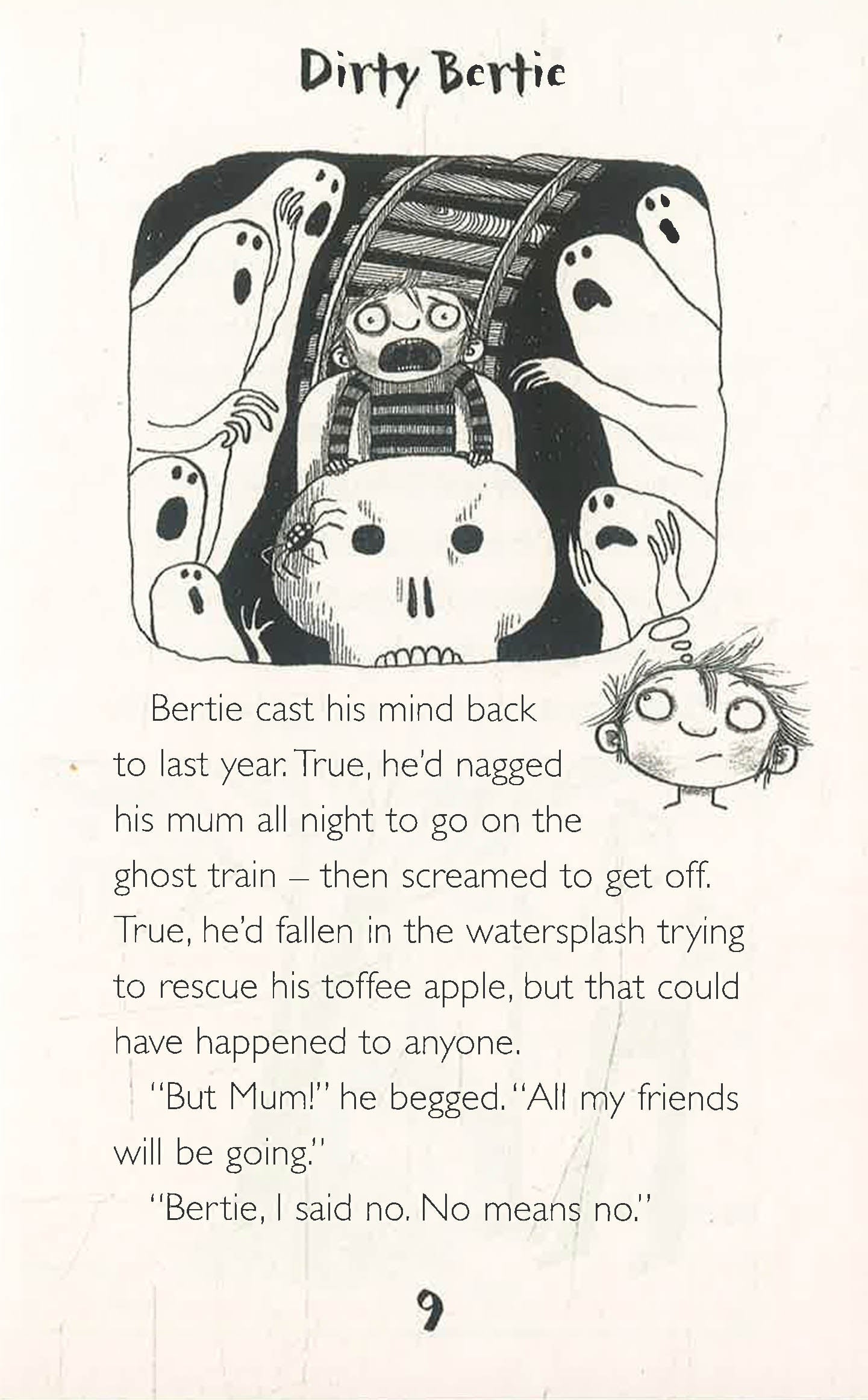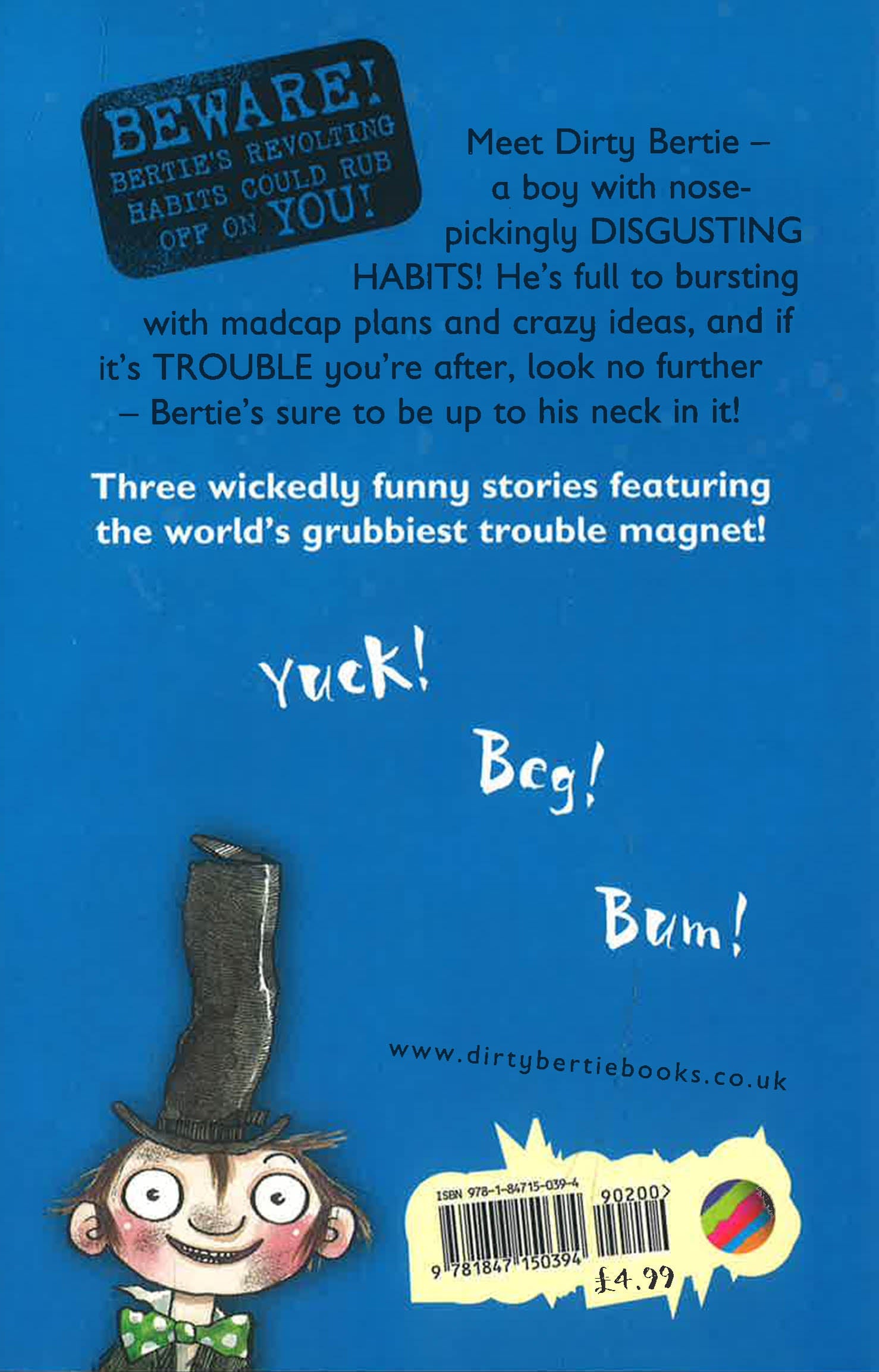Meet Dirty Bertie - a boy with nose-pickingly disgusting habits! He's full to bursting with madcap plans and crazy ideas, and if it's trouble you're after, look no further - Bertie's sure to be up to his neck in it. Bertie devises a new scheme for making filthy lucre, has a sickly time at the fairground and manages to teach a toddler her first word: Bum!
