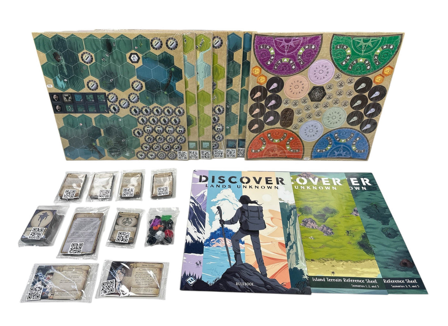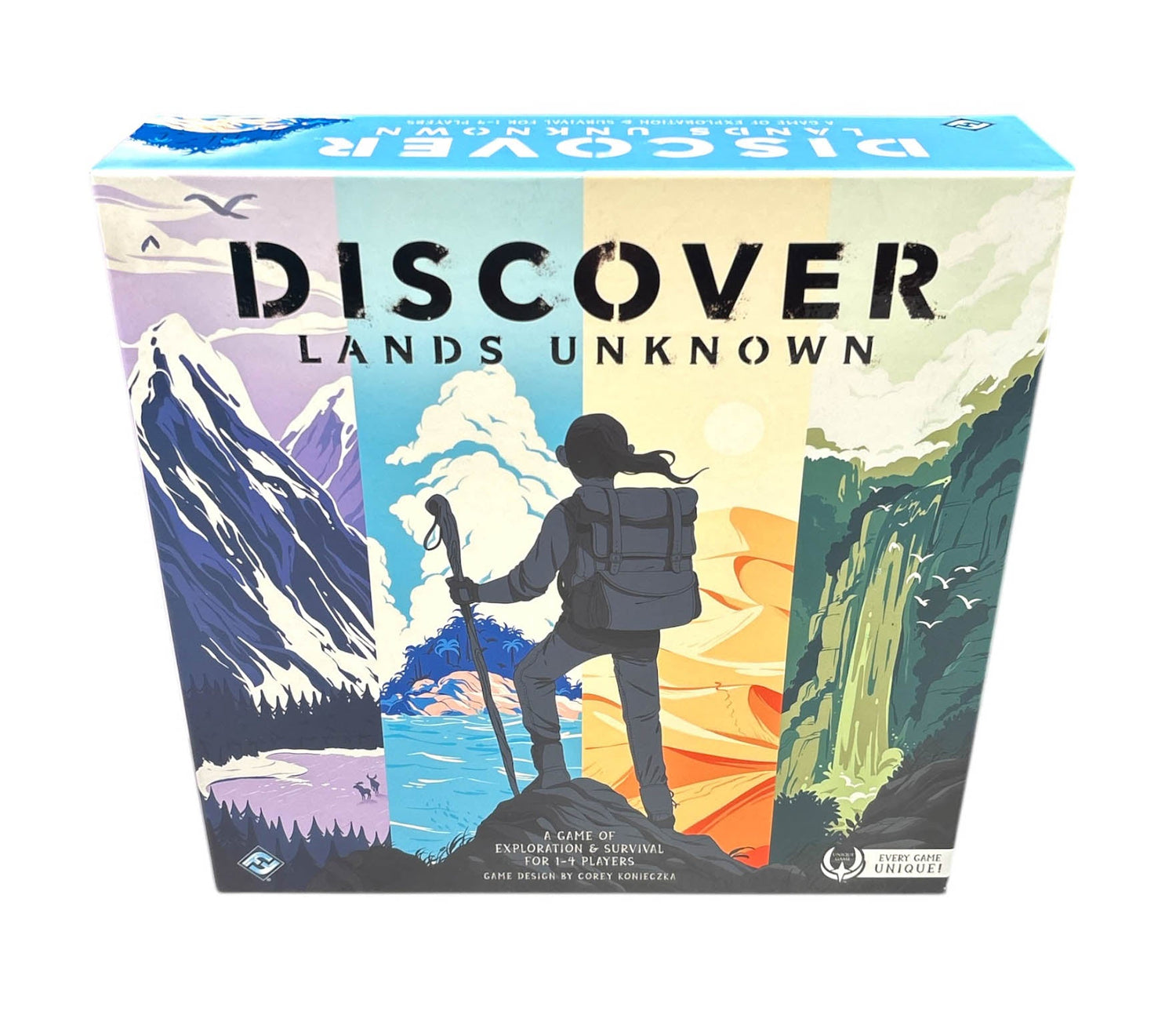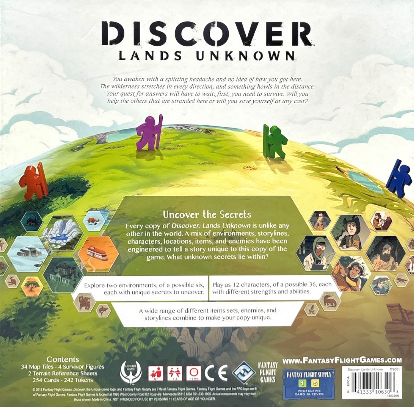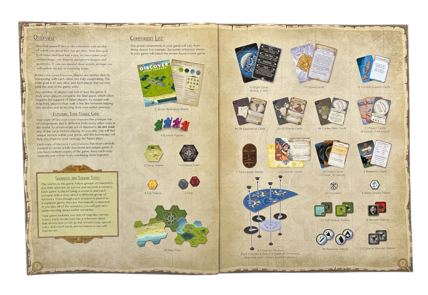 When two to four players find themselves marooned in the harsh wilderness, you must cooperate and compete to search for water, food, and tools that will be essential to your very survival. But your adventure holds many secrets. Every copy of Discover: Lands Unknown is unlike any other in the world. A mix of environments, storylines, characters, locations, items, and enemies have been engineered to tell a story unique to every copy of the game thanks to an algorithm that ensures no two copies are alike. Your copy will contain various tiles, cards, and tokens, each pulled from a shared pool of components, and the combination will be different from every other copy in the world.