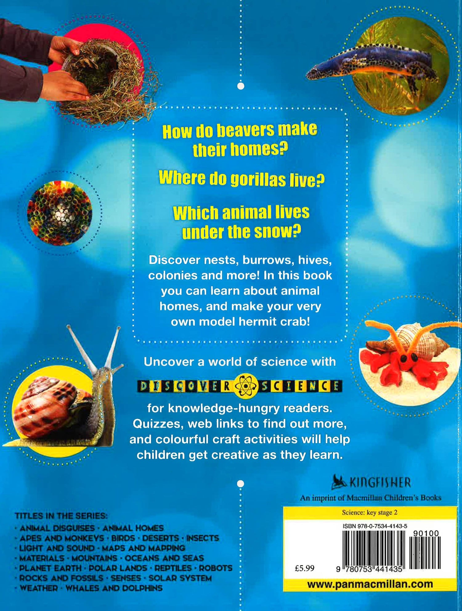 Learn how animals create and use their homes, from toad burrows to beaver lodges and beehives. Make science accessible with this essential series that will capture children's imagination while laying the foundation for future learning. With clear, simple language and a compelling design, Discover Science gives young readers the answers to fundamental questions about animal homes, birds, light and sound, materials, and more.