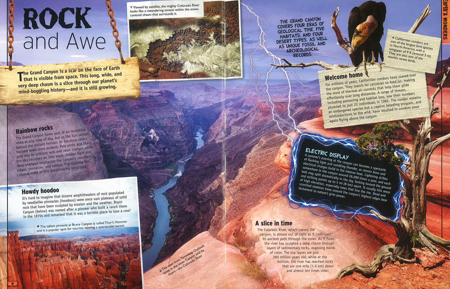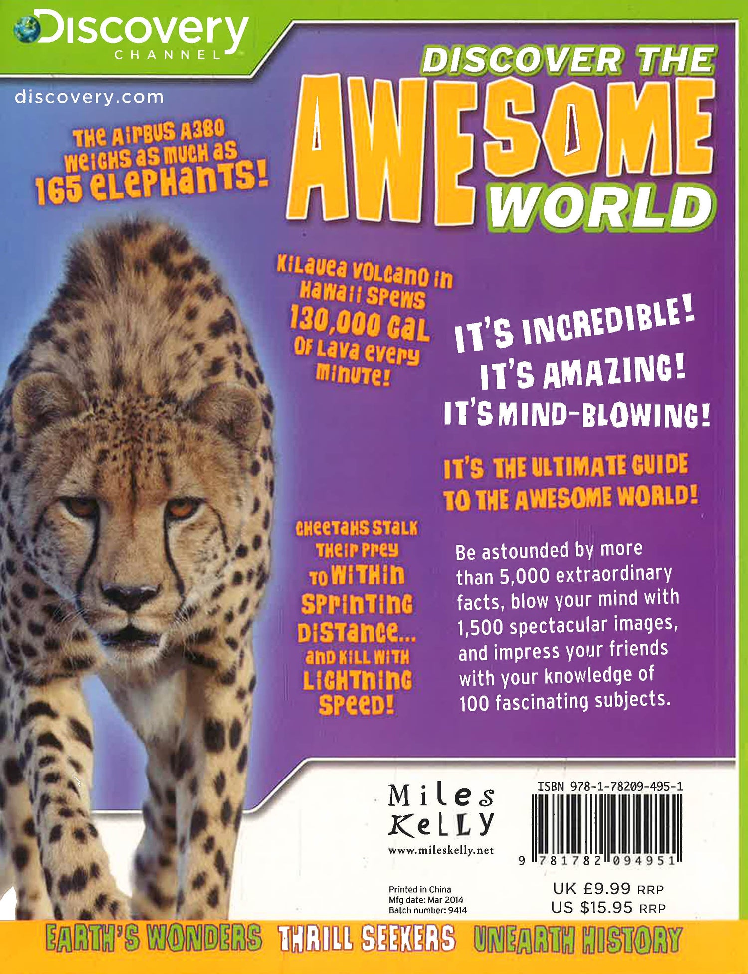 Hundreds of mind-blowing photographs and thousands of astonishing facts showcase our incredible planet and everything on it. Discover the Awesome World gives core reference subjects an awe-inspiring twist. From Earth's majestic features and nature's great events to the amazing feats of risk takers and incredible archeological discoveries, the dramatic, action-packed text and dynamic design concepts provide a thrilling reading experience.Six amazing chapters inside Discover the Awesome World: Earth's Wonders: Embark on an inspirational journey around Earth's extraordinary natural features. Amazing Nature: Witness the must-see moments of spontaneous behaviour of animals in the wild.Body Science: Take a top-to-toe tour of the human anatomy from amazing microscopic views to full-body X-rays.Speed Machines: Experience the awesome power of acceleration as you hurtle through adrenaline-fuelled world of speed.Thrill Seekers: Marvel at the amazing risks of daredevils pushing themselves to the limit.Unearth History: Discover the marvellous mysteries and unknown histories of ancient artefacts and lost cities.Kids will love to discover the world with fun facts such as: The Victoria Falls is about twice as wide and deep as the Niagara Falls. Its shimmering mist can be seen more than 12 mi (20 km) away.In the 'Death Zone', above 26,000 ft (8,000 m), the air is so thin that no climber can survive for long.In 1967, divers located a Greek city that sank beneath the waves about 3,000 years ago. Remains from the Pavlopetri site have been dated to between 2800 and 1200 BC.