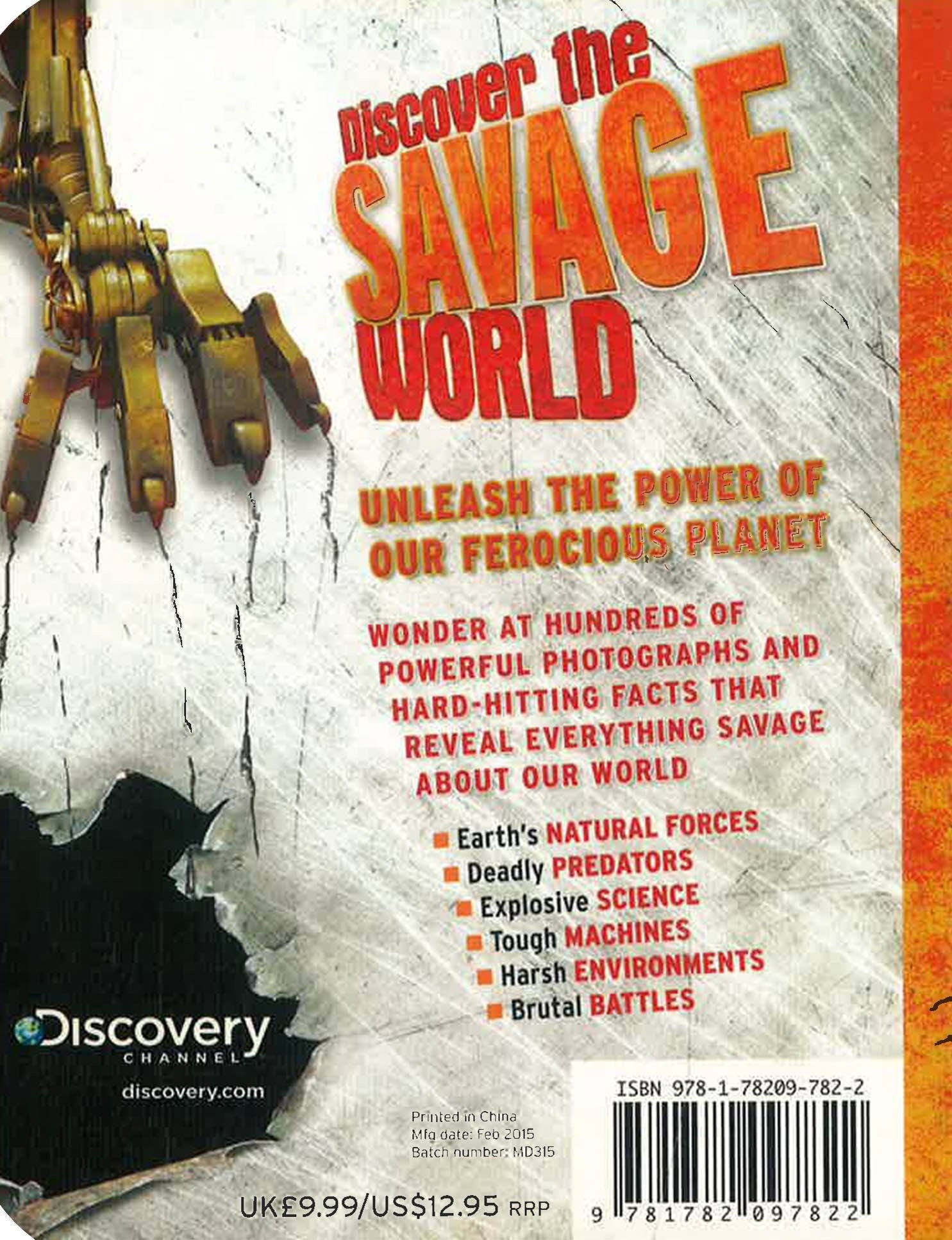 Mini Discovery Discover the Savage World is packed with dramatic photographs and hundreds of amazing facts showcase our incredible planet and everything on it. Produced in association with Discovery Channel, Discover the Savage World gives core reference subjects a fierce twist. From natural disasters and deadly animals to brutal battles throughout history and explosive science, the action-packed text and awesome design concepts provide a thrilling reading experience for children and adults alike. Get ready to face the brutal challenges of our savage world!