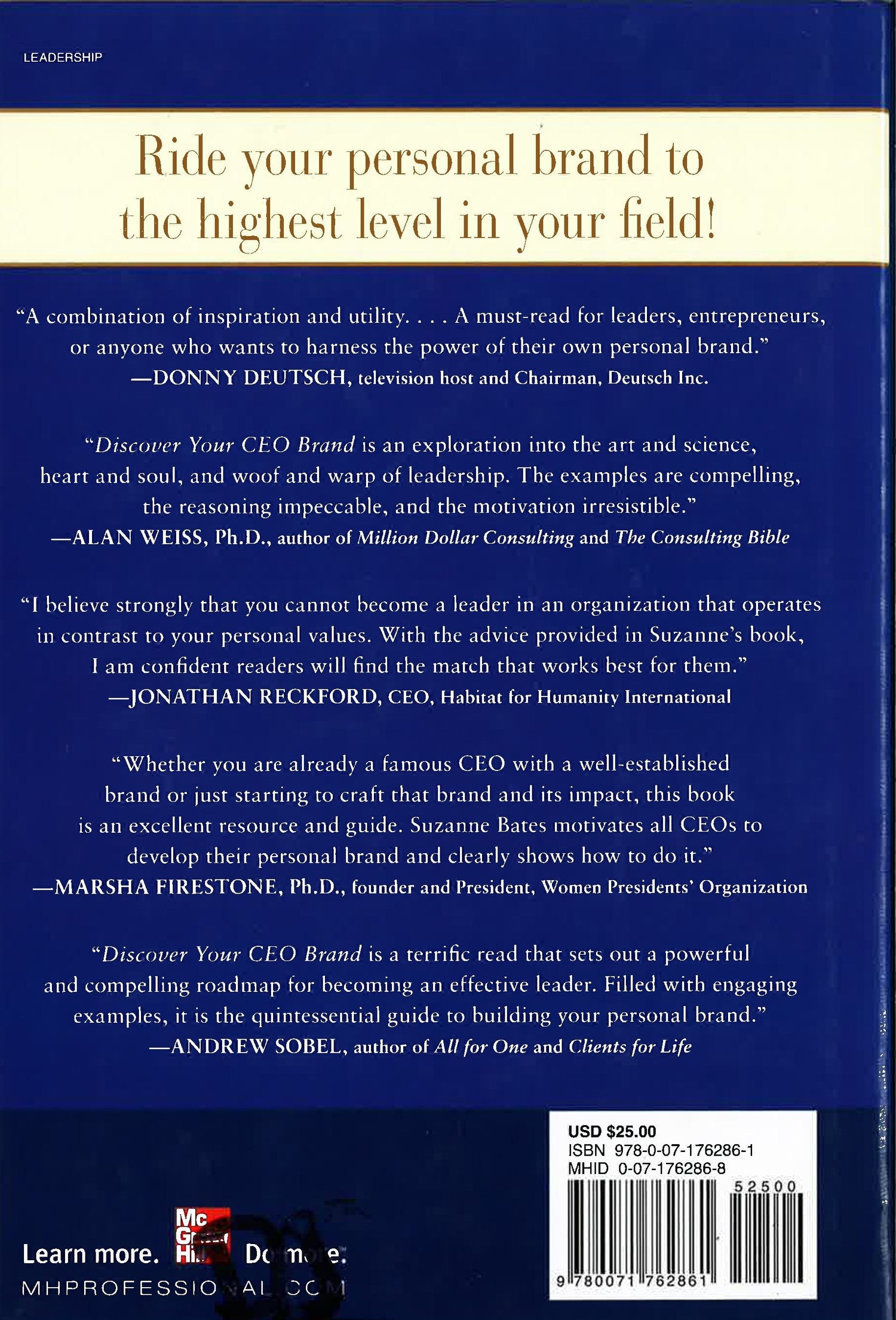 Ride your personal brand to the highest level in your field!"A combination of inspiration and utility. . . . A must-read for leaders, entrepreneurs, or anyone who wants to harness the power of their own personal brand."-DONNY DEUTSCH, television host and Chairman, Deutsch Inc."Discover Your CEO Brand is an exploration into the art and science, heart and soul, and woof and warp of leadership. The examples are compelling, the reasoning impeccable, and the motivation irresistible."-ALAN WEISS, Ph.D., author of Million Dollar Consulting and The Consulting Bible"I believe strongly that you cannot become a leader in an organization that operates in contrast to your personal values. With the advice provided in Suzanne's book, I am confident readers will find the match that works best for them."-JONATHAN RECKFORD, CEO, Habitat for Humanity International"Whether you are already a famous CEO with a well-established brand or just starting to craft that brand and its impact, this book is an excellent resource and guide. Suzanne Bates motivates all CEOs to develop their personal brand and clearly shows how to do it."-MARSHA FIRESTONE, Ph.D., founder and President, Women Presidents' Organization"Discover Your CEO Brand is a terrific read that sets out a powerful and compelling roadmap for becoming an effective leader. Filled with engaging examples, it is the quintessential guide to building your personal brand."-ANDREW SOBEL, author of All for One and Clients for LifeAbout the BookSteve Jobs did it at Apple. Indra Nooyi did it at Pepsi. Alan Mulally did it at Ford Motor Company.What did these business leaders do exactly? They brought very real, positive change to their organizations by using their unique CEO brand. Now, executive coach Suzanne Bates explains how you can exert the same kind of influence at your company.Discover Your CEO Brand provides the insight, knowledge, and tools you need to discover your own personal CEO style and then develop it into a powerful presence that extends beyond your typical spheres of influence. Bates walks you through the process step by step, teaching you ways to increase your visibility and influence by combining traditional self-branding vehicles like PR and face-to-face networking with new social-media platforms, including Facebook, Twitter, and blogs.No two sets of values, principles, vision, and skills-the foundation of every successful CEO brand-are alike. Whether you're a CEO, team leader, or entrepreneur, you need to discover who you are as a leader, what you believe, and how that defines you. It's not as apparent as you may think. Applying her years of expertise, Bates takes you deep below the surface to find the powerful leadership brand inside you, so you can:Connect with key audiencesElevate your leader profileAttract and retain the best talentCreate business opportunitiesShape a high-performance cultureDrive long-term value within your companyIt's not about crafting a leadership style out of thin air in order to influence people and "get ahead." It's about discovering your own personal leadership style. It's about connecting with others authentically. It's about instituting change that benefits the company and the people in it. You're about to head down a road to dramatically improving your organization, your career, and your life. Take your first steps with Suzanne Bates and the proven methods she outlines in Discover Your CEO Brand.