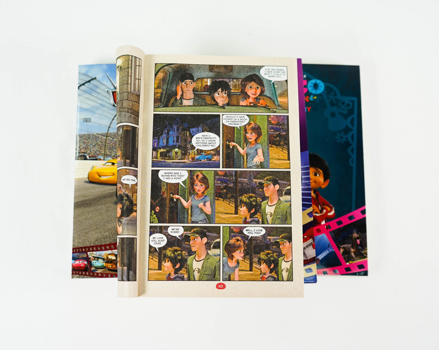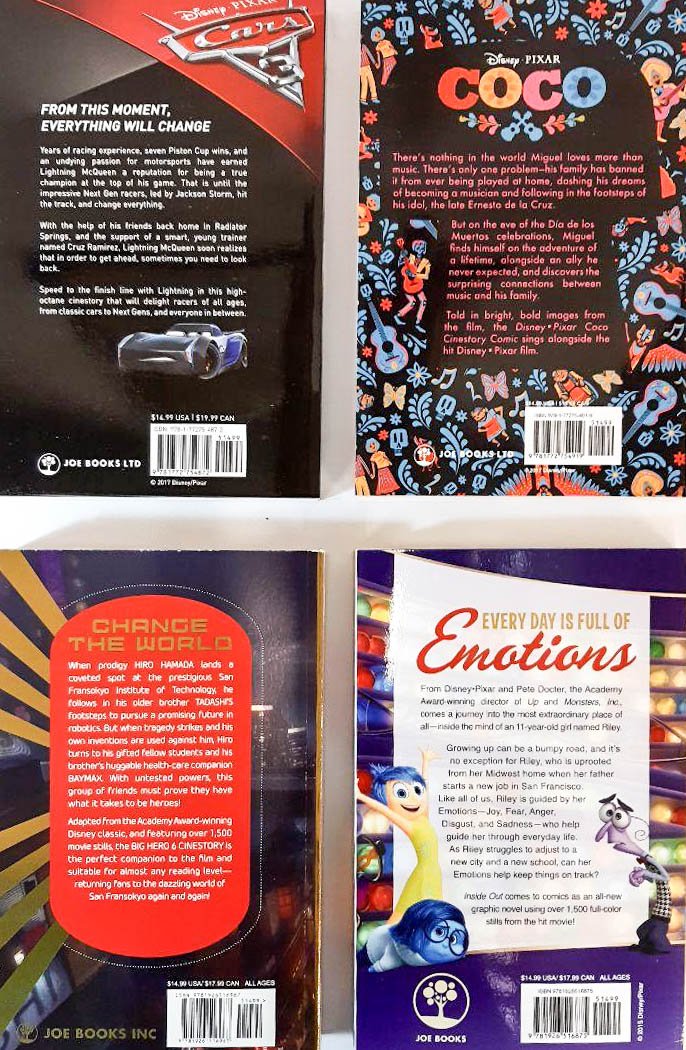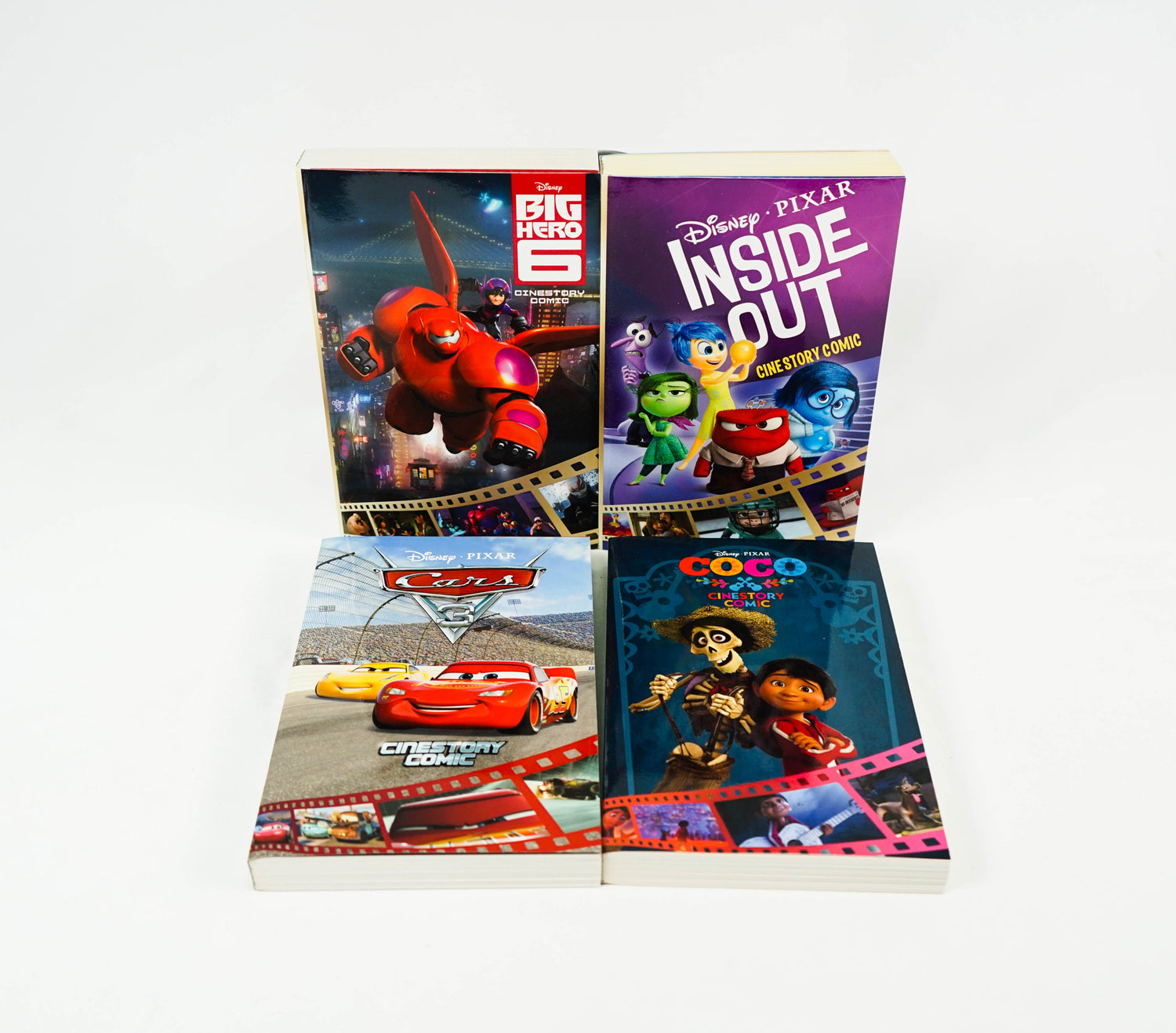 Experience your favorite Disney and Disney/Pixar animated films in a whole new way. Joe Books presents the Disney Blockbuster Boxed Set, an exciting collection of four cinestories including Disney Big Hero 6, Disney/Pixar Coco, Disney/Pixar Inside Out and Disney/Pixar Cars 3. Each cinestory is a graphic novel-style retelling of the film, featuring final frames from the movie in vibrant full color.