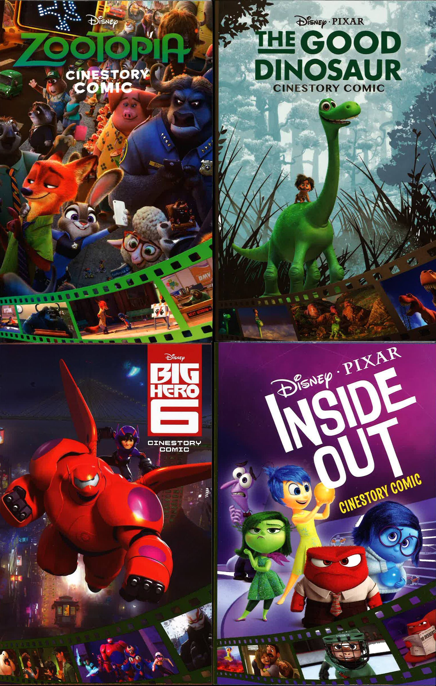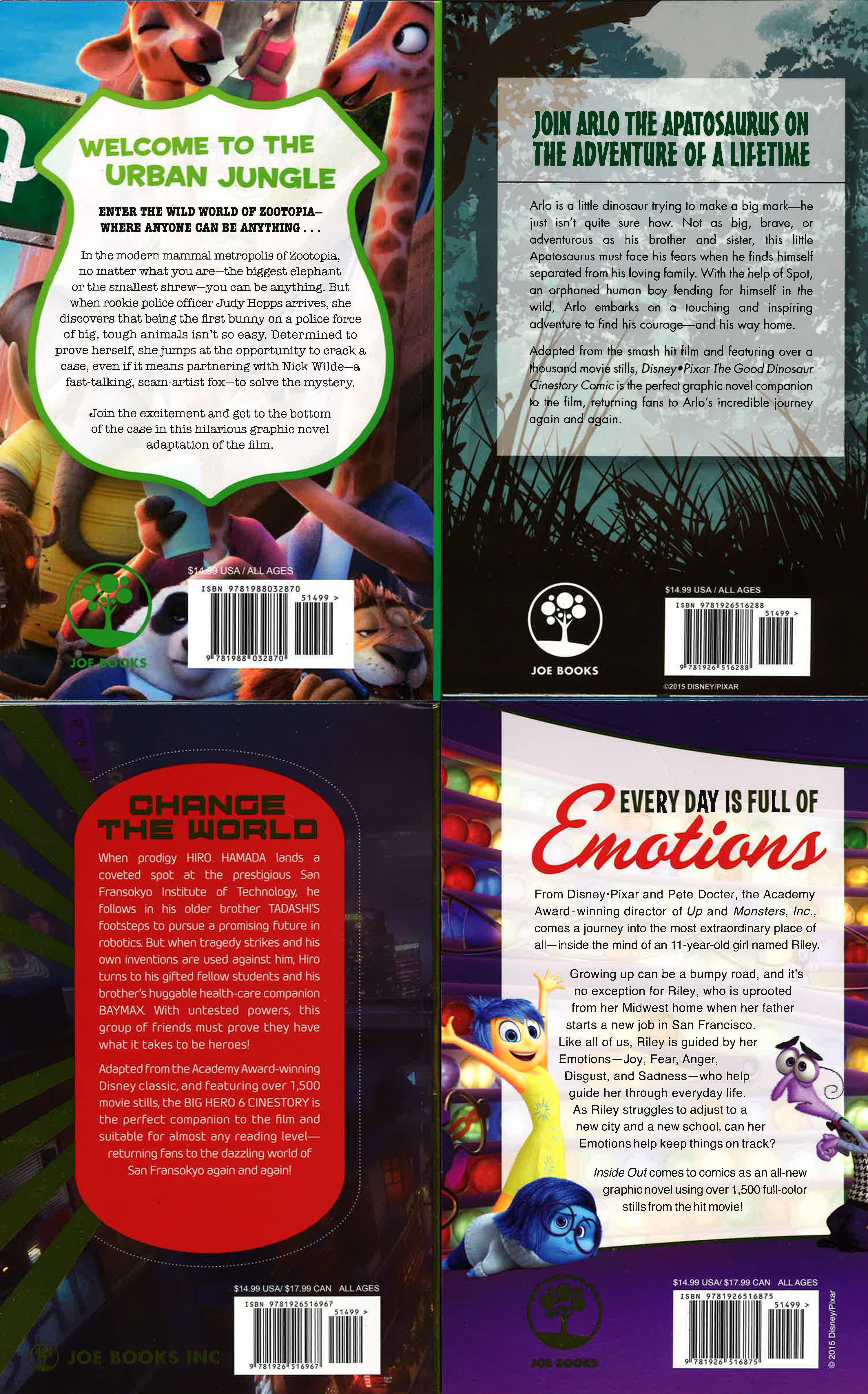 Experience your favorite Disney and Disney-Pixar animated films in a whole new way! Joe Books presents the Disney Cinestory Boxed Set, an exciting collection of four 384-page softcover cinestories including Disney Zootopia, Disney Big Hero 6, Disney-Pixar Inside Out and Disney-Pixar The Good Dinosaur. Each cinestory is a graphic novel-style retelling of the film, featuring final frames from the movie in vibrant, full-color.