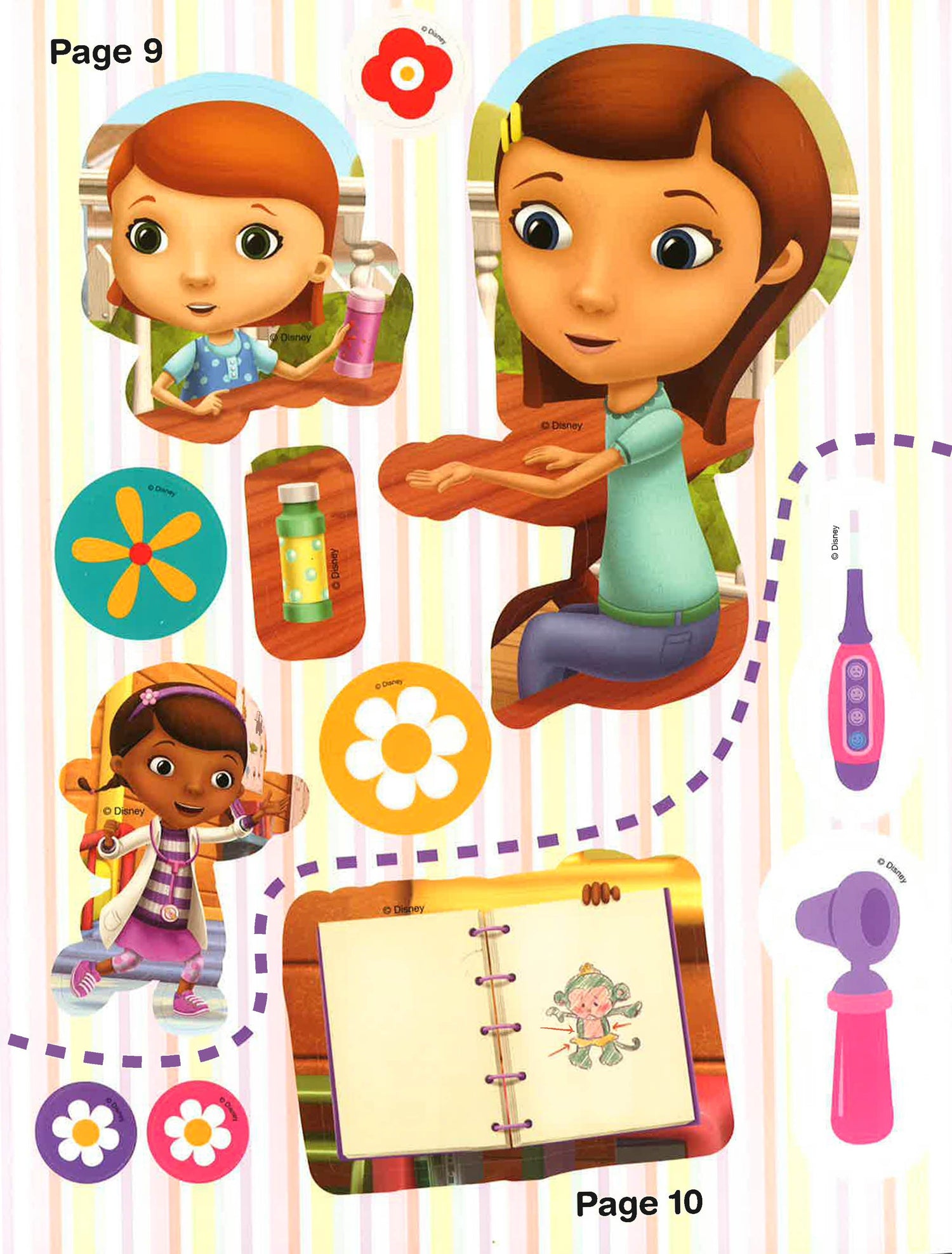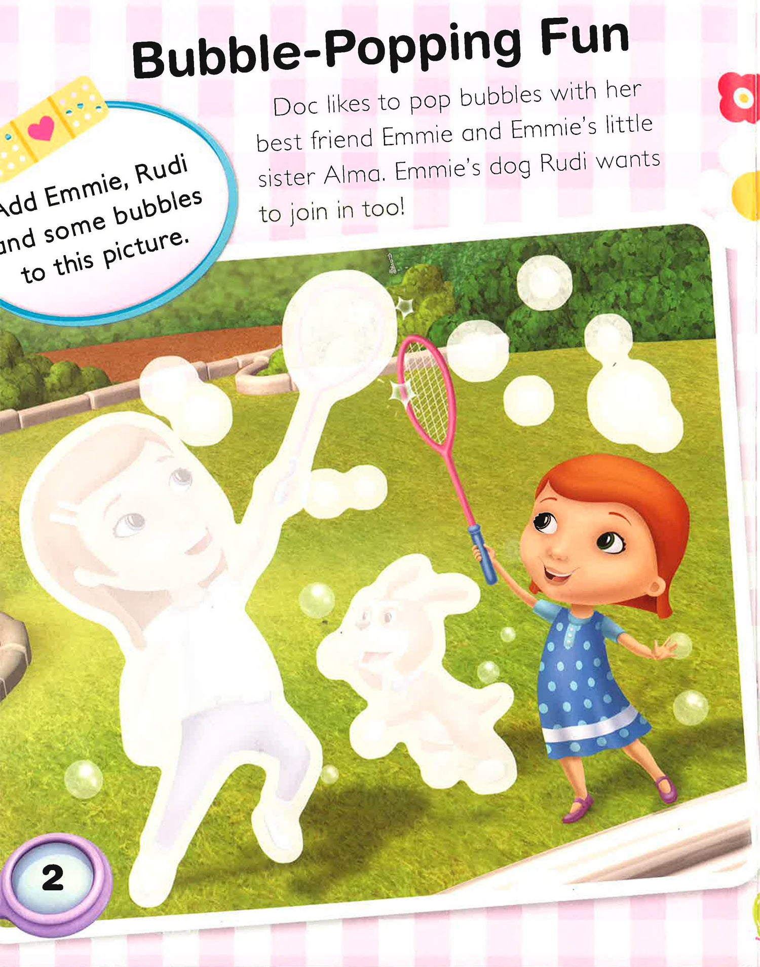 Doc McStuffins loves popping bubbles with her friends. But when Bubble Monkey suddenly stops working, there are no more bubbles to pop! Can Doc fix Bubble Monkey? Complete the scenes with your stickers and find out!