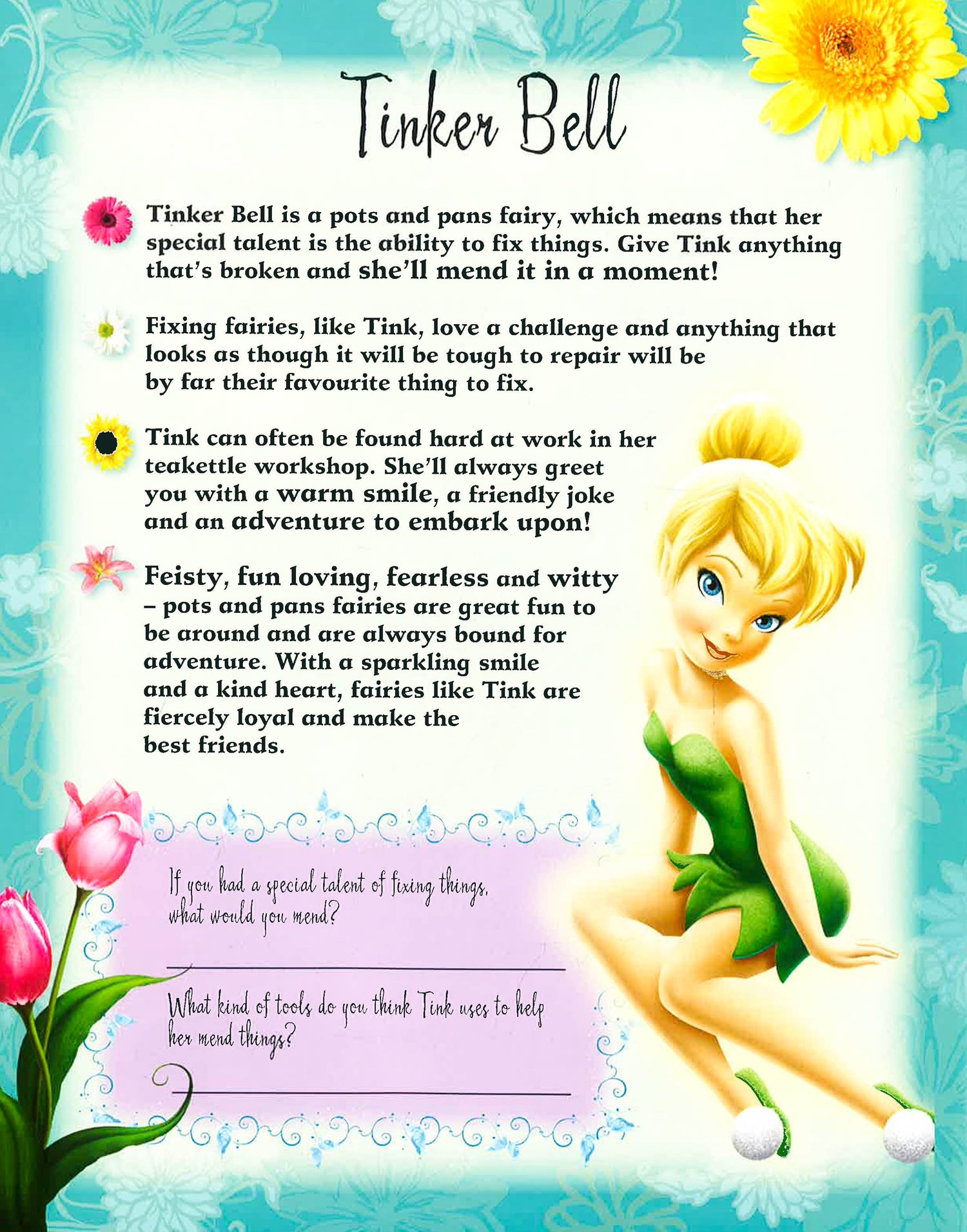 Tinker Bell invites you to discover the mystical secrets of the Never Fairies! Complete these fairy activities and fall under the spell of Pixie Hollow. Read the magical stories to learn the secrets and spells of Tink and her friends, and to discover your own special fairy name. Then use the stickers provided (plus a touch of your own magical pixie dust) to meet the friends and show that you believe! Includes over 100 glittery stickers.