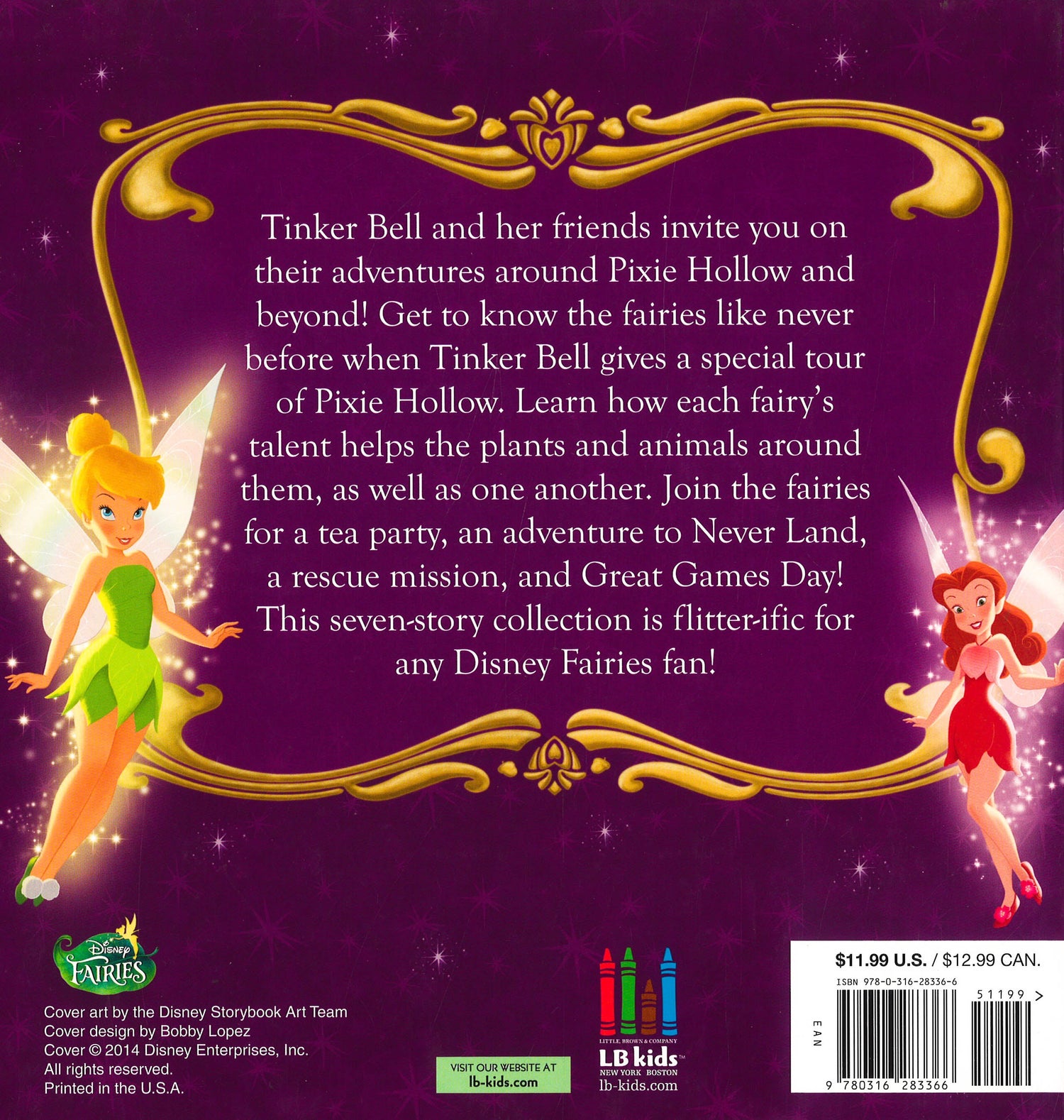 Tinker Bell and her friends invite you on their adventures around Pixie Hollow and beyond! Get to know the fairies like never before when Tinker Bell gives a special tour of Pixie Hollow. Learn how each fairy's talent helps the plants and animals around them, as well as one another. Join the fairies for a tea party, an adventure to Never Land, a rescue mission, and Great Games Day! This seven-story collection is flitter-ific for any Disney Fairies fan! (c) Disney 2014