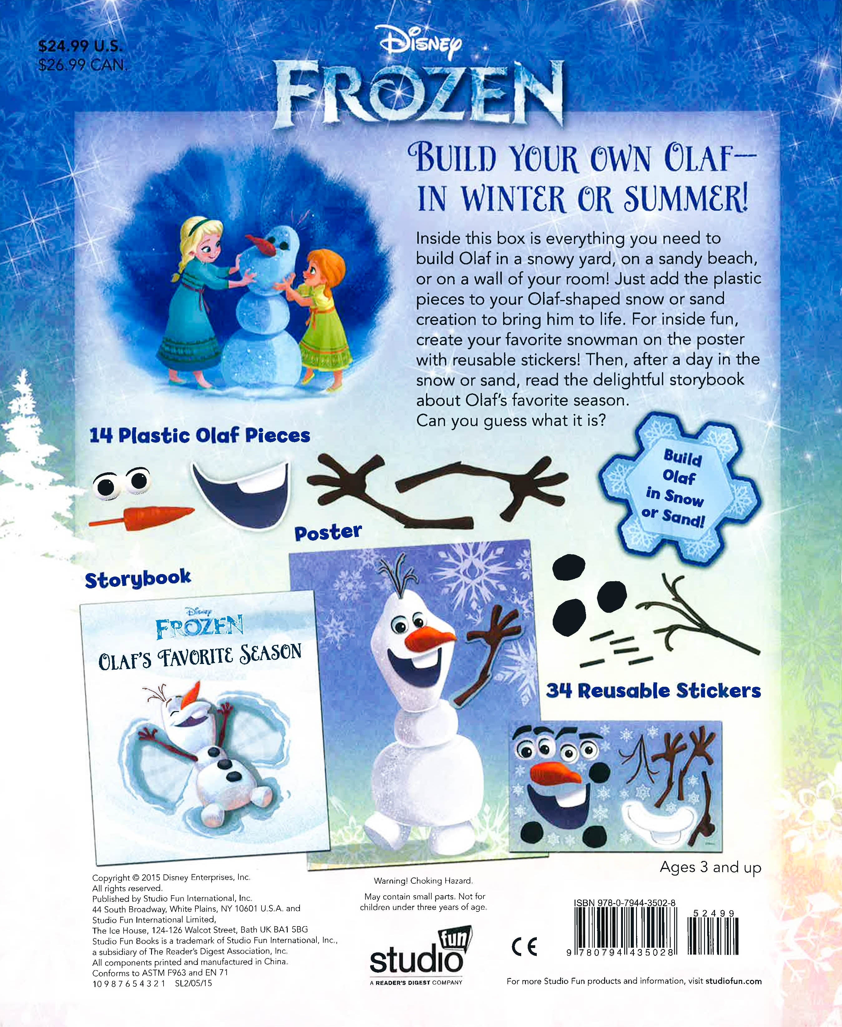 Olaf comes to life in your front yard with this book that also includes all the pieces to build the beloved snowman of "Frozen"! Olaf, the warm-hearted snowman of Disney s mega-hit, "Frozen," can now come to life outside every reader s home this winter! This retelling of the classic story also includes all the pieces from his tree-limb arms to his carrot nose to make Olaf the snowman right in your front yard!