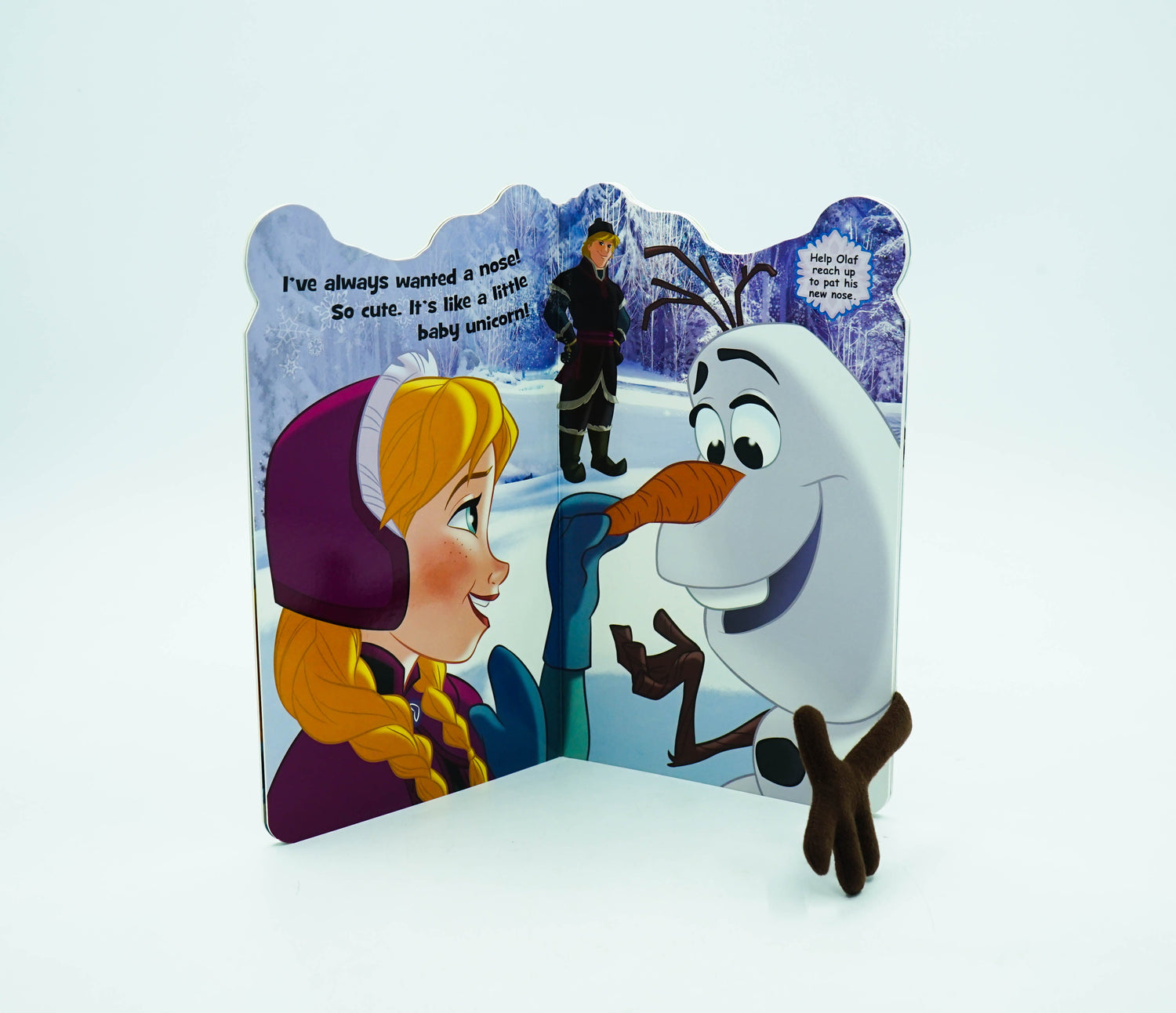 From the blockbuster hit Disney's "Frozen," comes Olaf, a lovable snowman who loves hugs! Guide Olaf's snuggly arms to hug and pat those he loves in this adorable board book. Olaf loves warm hugs! In this specially shaped board book featuring favorite quotes from Disney's "Frozen," Olaf has two plush arms to interact with every spread. With lots of hugging, patting, blowing kisses and waving, kids ages 2 5 will happily return to this adorable book over and over again!