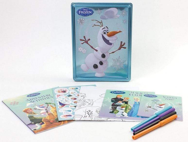 Join Olaf, Anna, Elsa, and all their friends from the hit Disney film Frozen for some magical fun and adventure! Inside this wonderful collectable tin you'll discover two fantastic activity books and an enchanting coloring book, as well as a double-sided poster for you to color, 50 ice-cool stickers, and 4 markers. It's a tin full of fun!