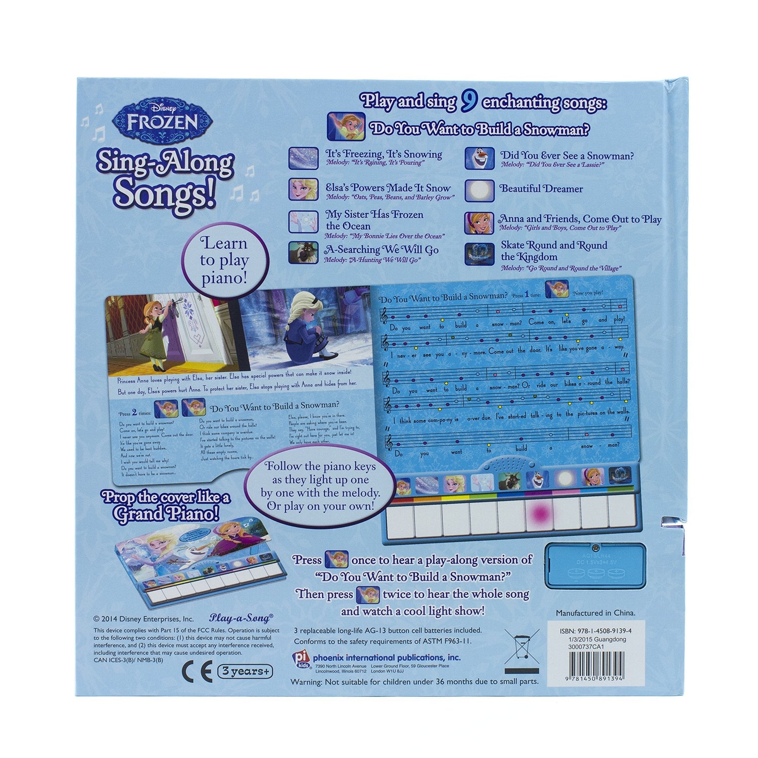 Sing and play along to favorite children's songs! Keys light up to show beginners which notes to play.The story of Frozen is told through fun and engaging songs. Each spread will feature simple story text to help further explain the story moments. When the child presses a melody button, the song plays and keys light up, showing which key plays which note. After the song stops playing, each key in the song lights up again so the child can play the notes herself. The child also can follow the simplified sheet music on each spread to play songs Play and sing 9 enchanting songs.Features "Do You Want to Build a Snowman?"