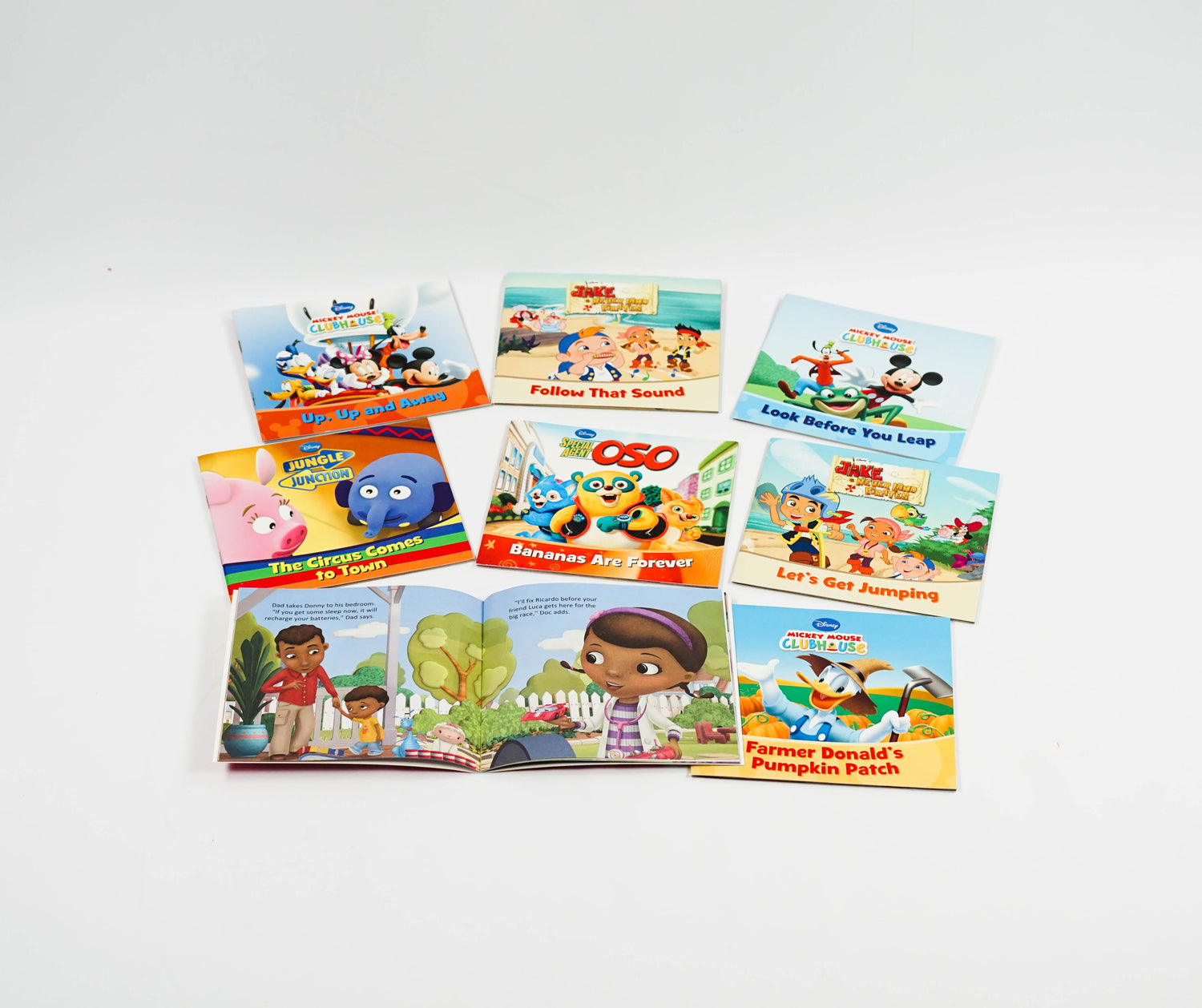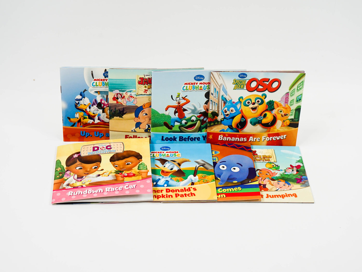 Your Disney Junior pals are ready to play in these eight stories. Fly in a hot-air balloon with Mickey, fix toys with Doc, have an adventure with Jake and much more.