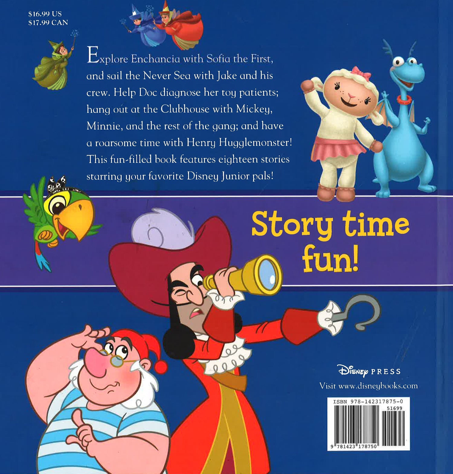 Sail the Never Sea with Jake and the crew, diagnose toys with Doc in her backyard clinic, experience royal fun with Sofia, practice your best roar with Henry Hugglemonster, visit Minnie's Bow-tique, and join the Clubhouse's gang all in one book! This beautifully illustrated storybook collection includes gilded pages, over 250 full-color illustrations, and 18 stories featuring your favorite Disney Junior characters and shows: Jake and the Never Land Pirates, Doc McStuffins, Sofia the First, Minnie's Bow-Toons, and Mickey Mouse Clubhouse.